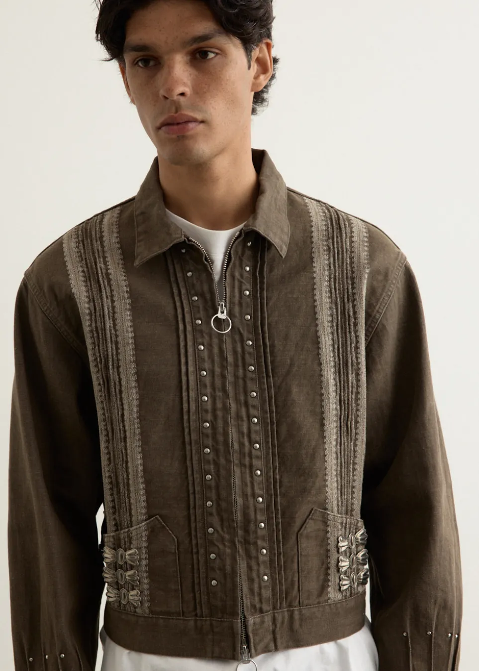Paying homage to its hometown Kojima, Okayama – an area dubbed Japan’s denim capital – Kapital creates workwear-inspired pieces with a distinct edge. The Drizzler Jacket delivers a Japanese workwear aesthetic to your wardrobe. Crafted from a 12oz jacquard denim, a fabric the country is celebrated for, the jacket features symmetrical ikat design running from the top to the hem, where they meet the front pockets that are detailed with butterfly shaped silver plated brass accents. A two-way zip and front pockets offers added convenience to this hardworking outwear essential.