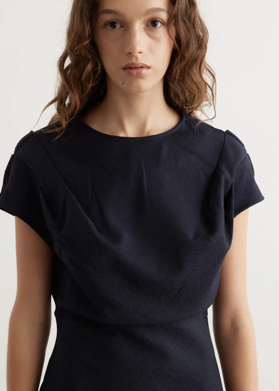 – Capped sleeves with tucks
