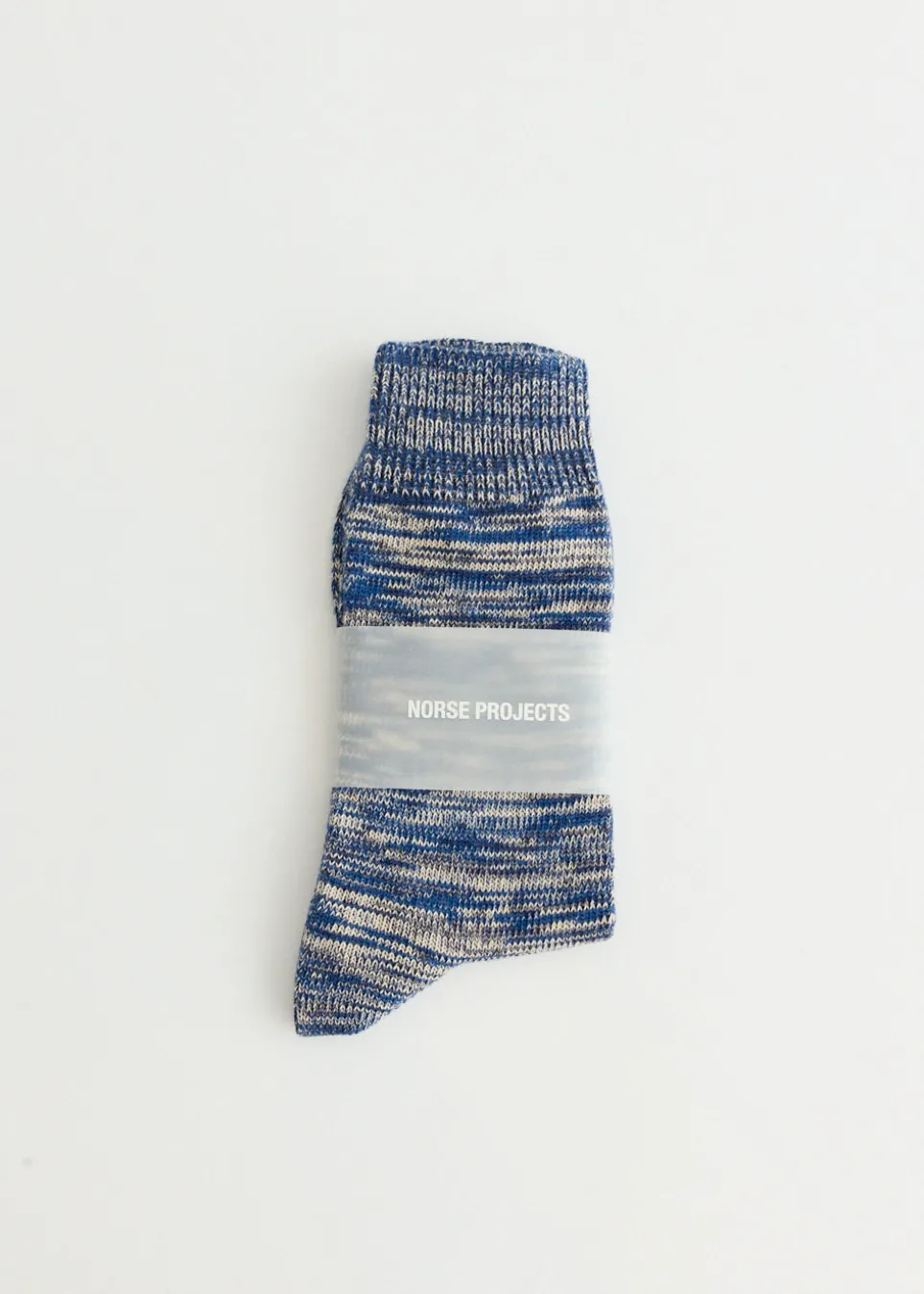 Norse Projects brings its Danish brand of cool to everyday classics. With a tagline “Created for life, good for all seasons”, each collection is designed to make an impact on your wardrobe year after year. Knitted in twisted heavy cotton yarn to create a striped mouliné effect, the Bjarki Cotton Twist Socks are finished with ribbing at the sole and ankle and a transferred logo on the inside arch.