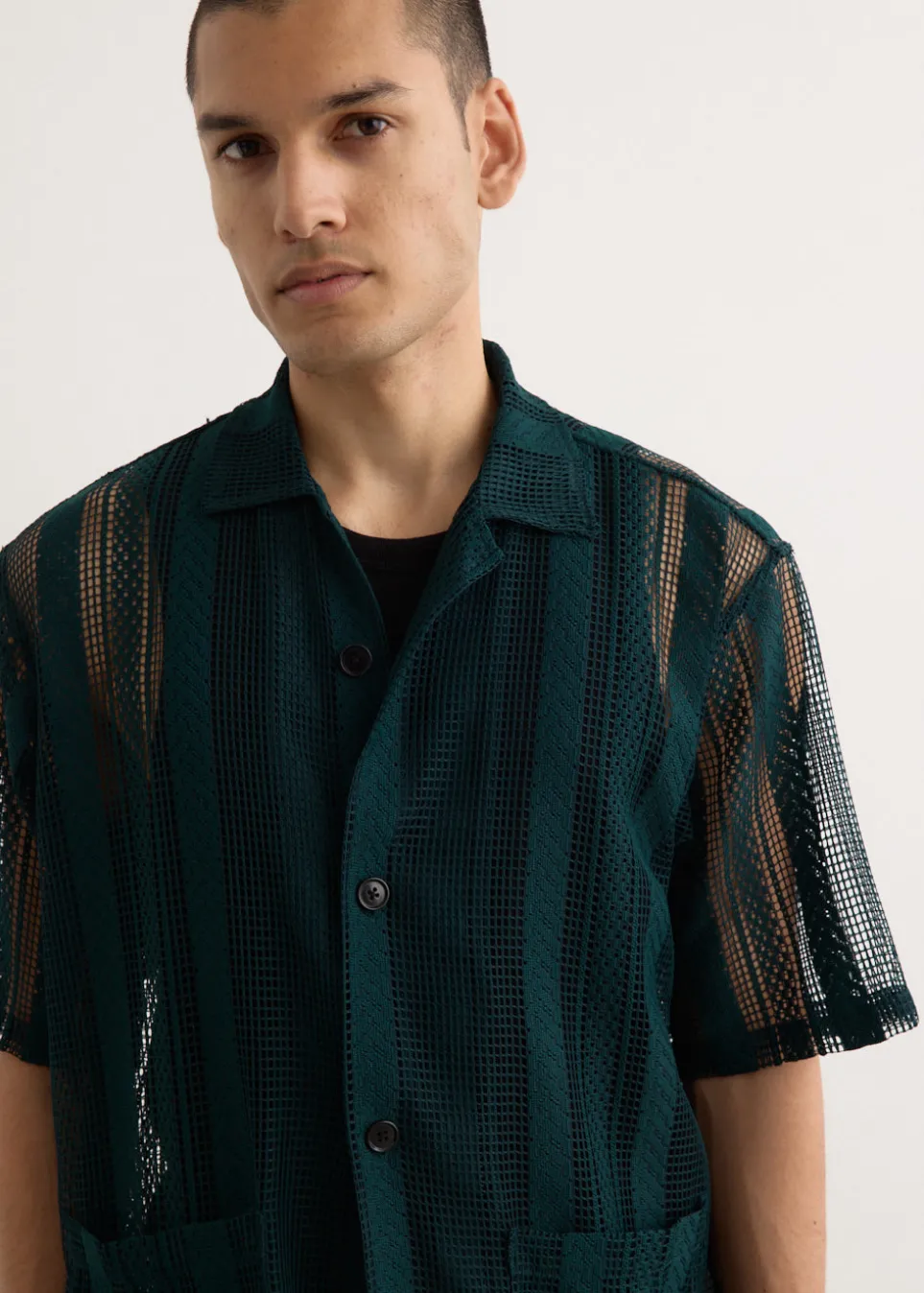 Part of the Nepenthes family, South2 West8 blends fashion and function, drawing inspiration from the serene world of ‘Tenkara’ mountain stream fishing. The label offers practical designs that cater to outdoor enthusiasts while maintaining a distinct, stylish edge. Made from polyester, the Cabana Shirt features a sheer open-mesh lace design and is finished with front patch pockets.