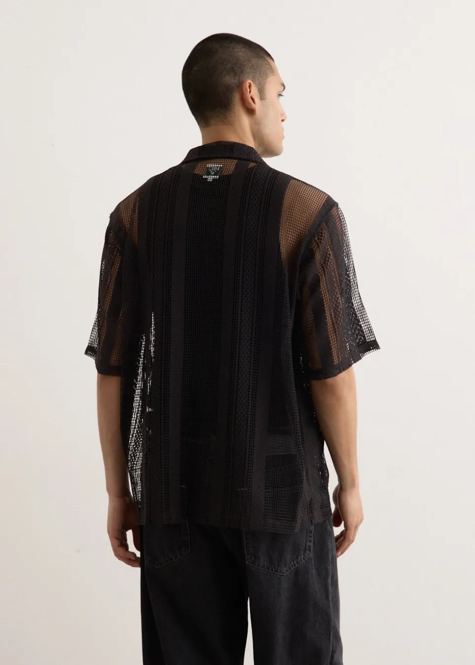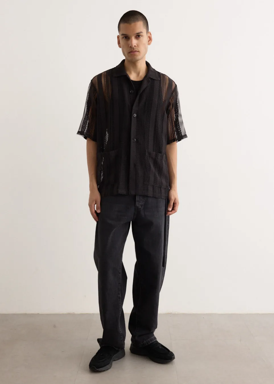 Part of the Nepenthes family, South2 West8 blends fashion and function, drawing inspiration from the serene world of ‘Tenkara’ mountain stream fishing. The label offers practical designs that cater to outdoor enthusiasts while maintaining a distinct, stylish edge. Made from polyester, the Cabana Shirt features a sheer open-mesh lace design and is finished with front patch pockets.