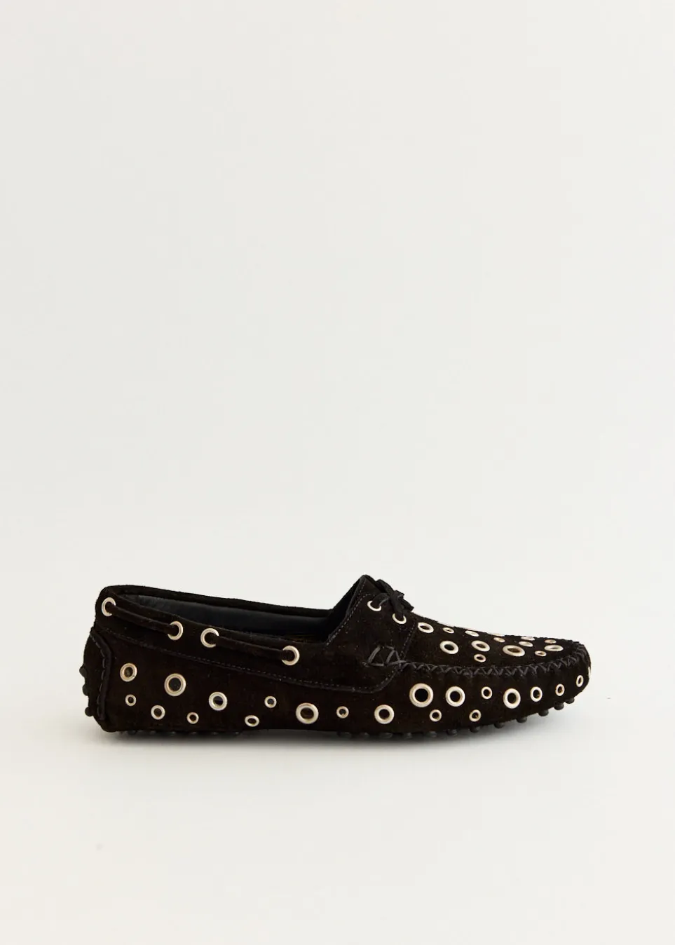 Founded in 2018 by twins Claudia and Sayana Durany, Gimaguas is powered by relationships and conversation. A focus on carefree silhouettes, bespoke prints, technical knitwear and craft-inspired detail. All Gimaguas pieces are designed in Barcelona. Crafted from soft suede leather, the Car Shoes Eyelets reimagines the classic moccasin silhouette with unique detailing. Featuring a slip-on style and traditional construction, the design is accented with leather laces along the front and sides. Polished silver eyelets punctuate the upper, lending a distinctive, statement finish.