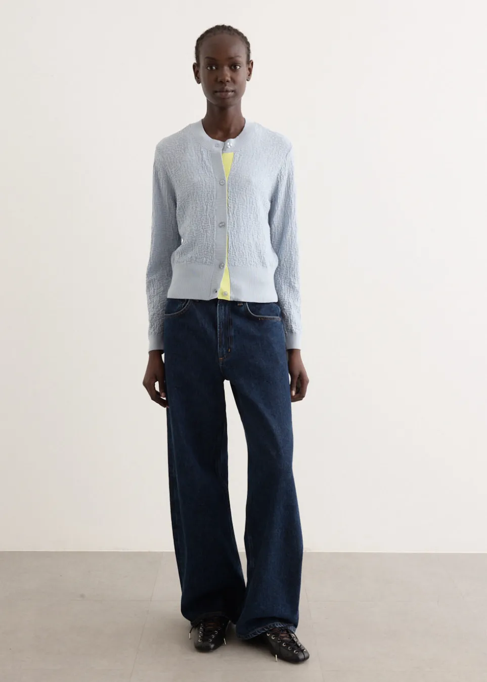 Brainchild of the designer duo Rikke Baumgarten and Helle Hestehave, Baum und Pferdgarten is the Danish label that blends modern feminine style with a playful sensibility. Crafted from a slightly crinkled cotton blend, the Chea Cardigan is cut to a cropped length featuring a round neckline and ribbed trims. The classic cardigan’s fitted silhouette is detailed with a contrast inner placket for a unique touch.