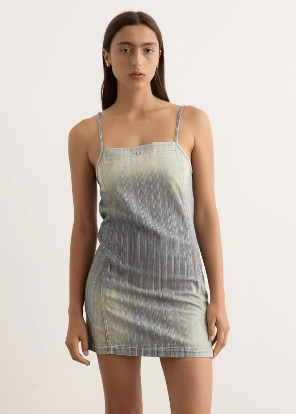 Founded in 1978, Diesel is rooted in denim mastery, known for their nostalgic Y2K-inspired pieces to create a chic yet casual look. Their collections sport denim-heavy designs in their rebellious yet playful collections. Crafted from fix denim with an irregular white-and-indigo striped weave, the De Betty Dress is a mini dress featuring a straight-cut silhouette, slim straps, and a metal D detail on the front. Stonewashing, hand-sanding, and abrasions enhance its textured, worn-in look.