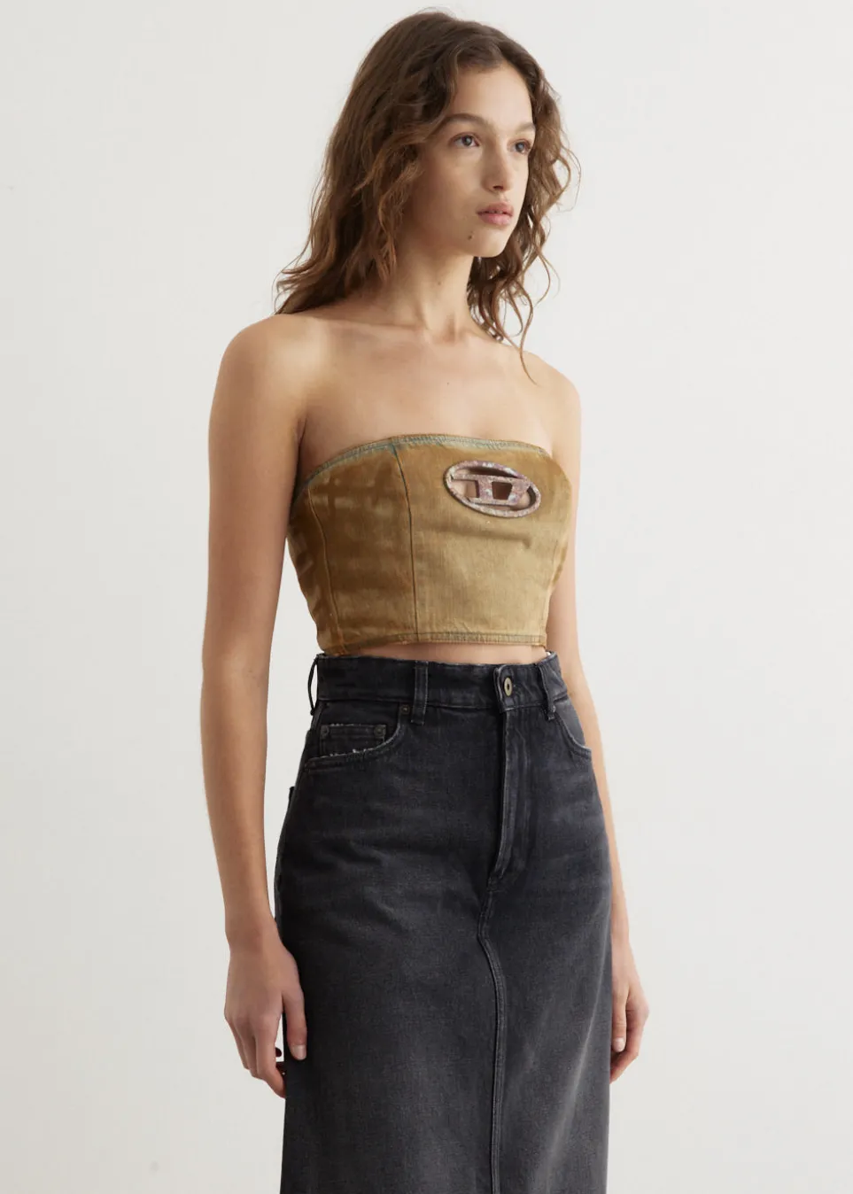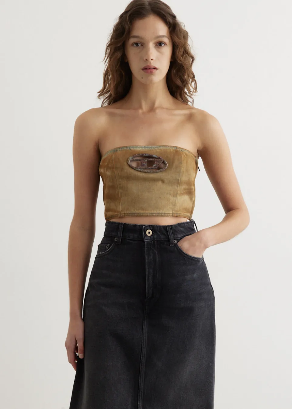 Founded in 1978, Diesel is rooted in denim mastery, known for their nostalgic Y2K-inspired pieces to create a chic yet casual look. Sporting denim-heavy designs in their rebellious yet playful collections. Crafted from rigid cotton denim, the De-Villess-Fsf Top is cut to a mini bandeau style and is adorned with a metal Oval D plaque on the chest.