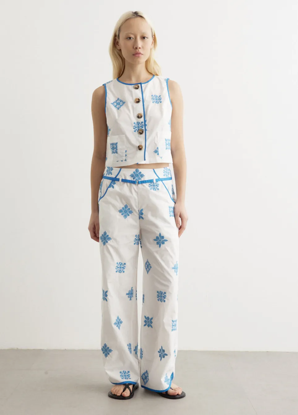The California-based brand Ciao Lucia, places vintage references at the heart of its design DNA. The Esteban Pants boast a straight leg and is adorned with an intricate floral embroidery. The rear zip closure provides a sleek silhouette, while the waist belt adds a touch of style and allows for a personalised fit.