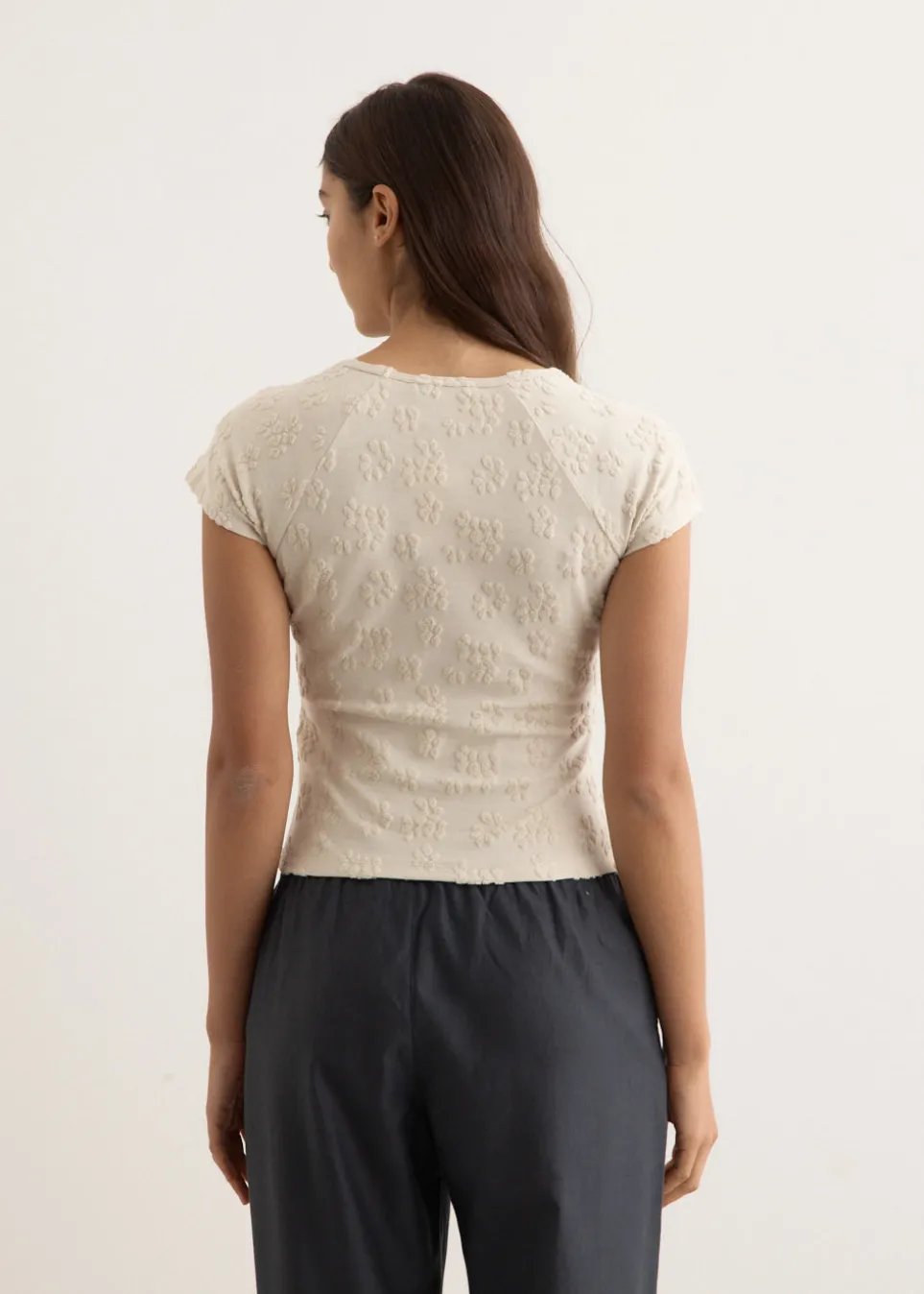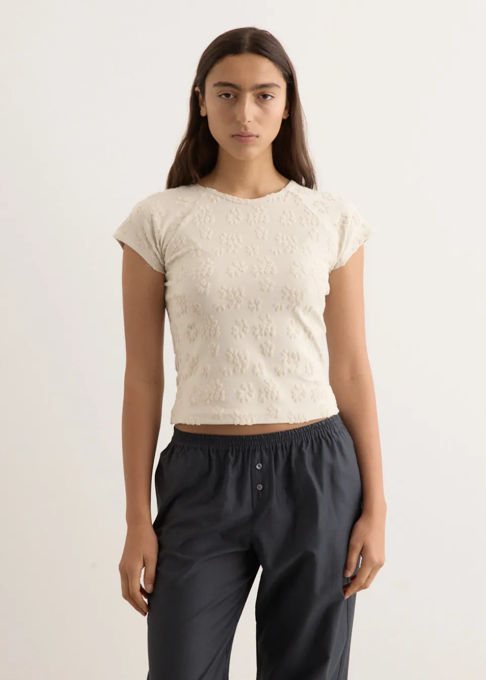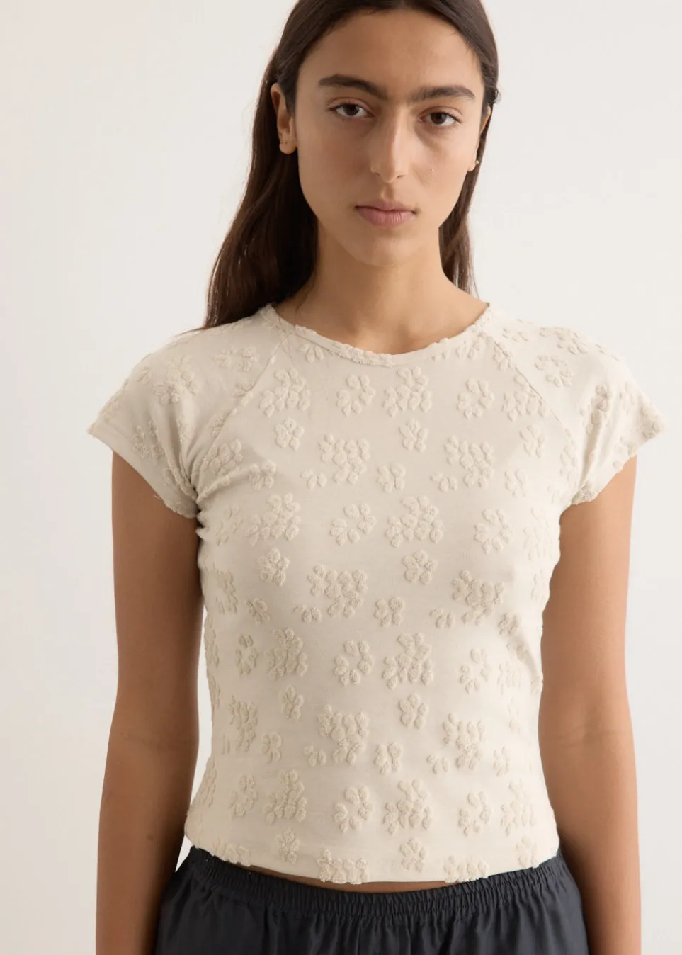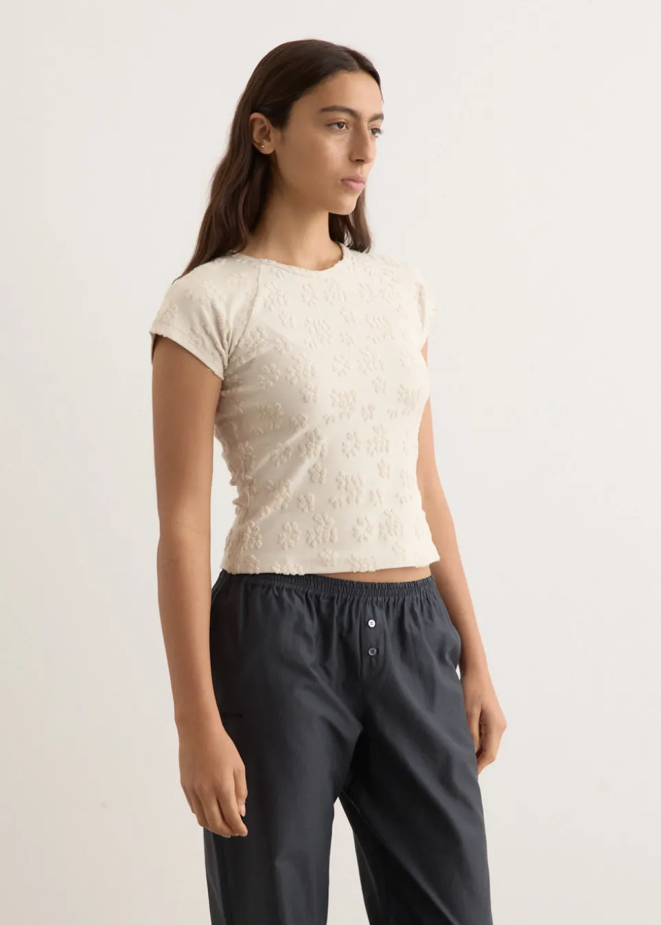 Barcelona-based brand Paloma Wool is renowned for its artisanal quality, retro silhouettes and the art of getting dressed. Crafted from a floral jacquard terry-effect fabrication, the Fabri Top is cut to a slim fit. Featuring a smooth base, with raised towel-like textured patterns.