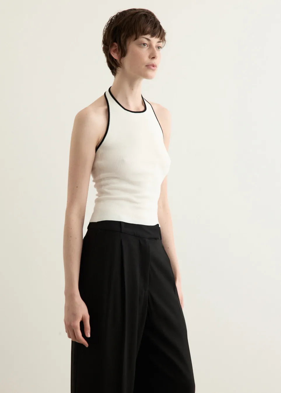 Founded by Lara and Matt Fells, St. Agni is a Byron Bay-based design studio known for its minimalist aesthetic, refined tailoring, and evolution from handwoven leather accessories to thoughtfully crafted ready-to-wear. The Fine Line Halter Top is cut to a sleek, silhouette featuring a halter neckline and scooped back. Finished with contrast piping for a refined touch, it can be worn alone or layered for versatile styling.