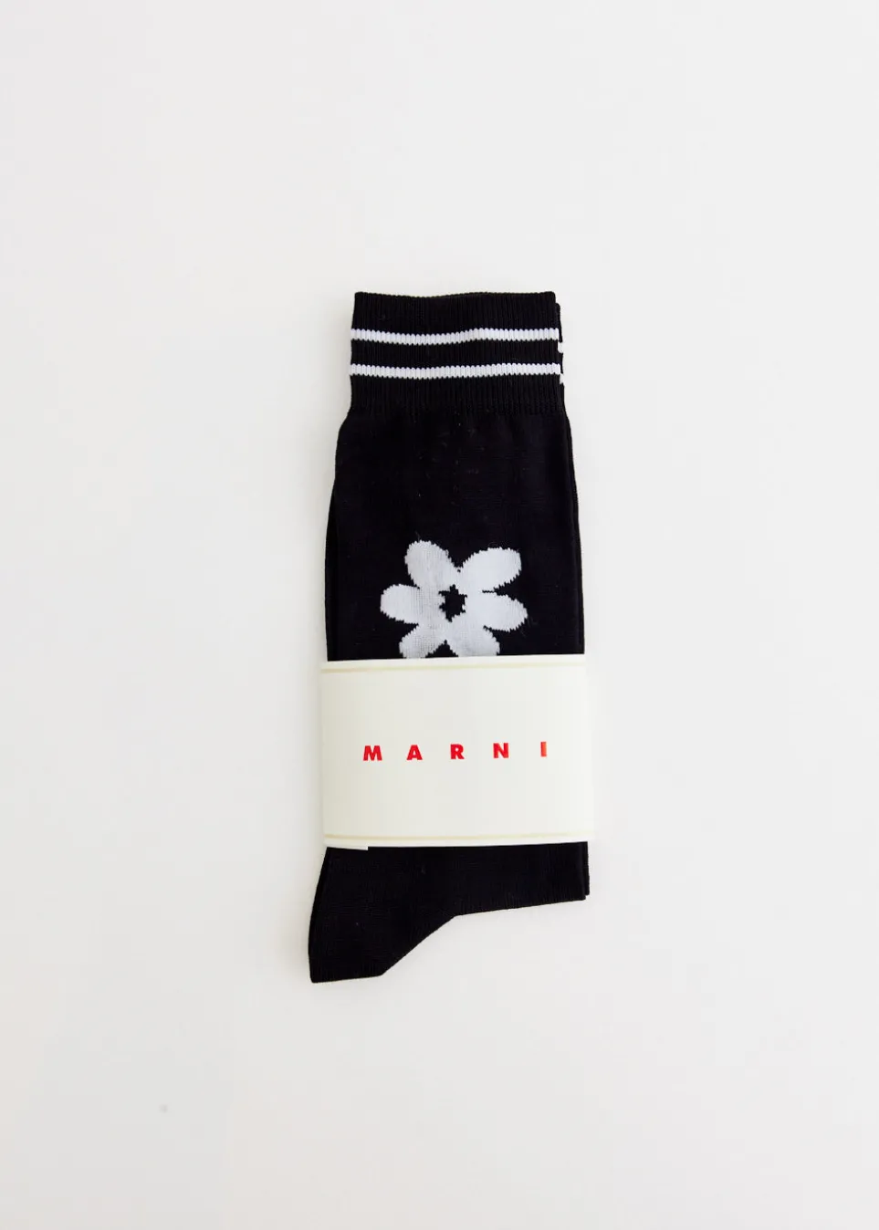 Marni balances luxury with sophistication and a subtle touch of humour. The Italian fashion has delivered idiosyncratic designs since 1994. The Flower Intarsia Socks features a contrasting flower and logo and at the collars with stripes.