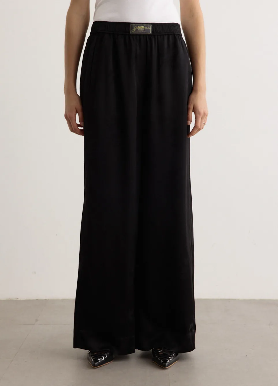 Danish label Ganni blends streetwear trends with a playful touch of humour through bold prints and colour palettes, voluminous silhouettes and easy-to-wear fabrics. The Fluid Satin Jacquard Elasticated Pants are crafted from a soft, flowy fabric with a delicate jacquard-woven pattern. Featuring an elasticated waistband, a GANNI label, a decorative back pocket, and relaxed, wide legs.