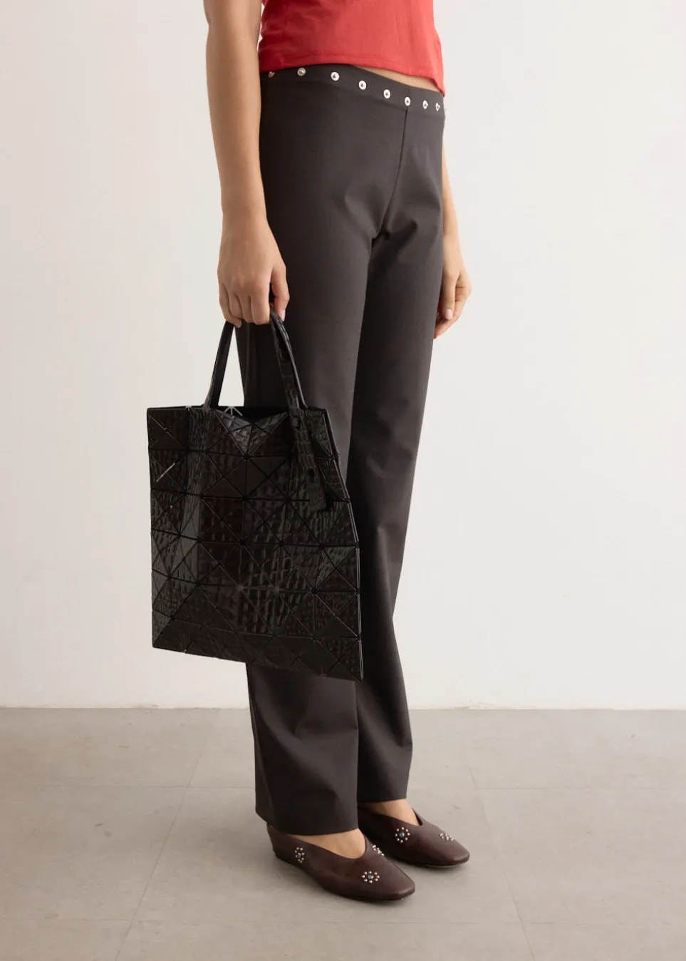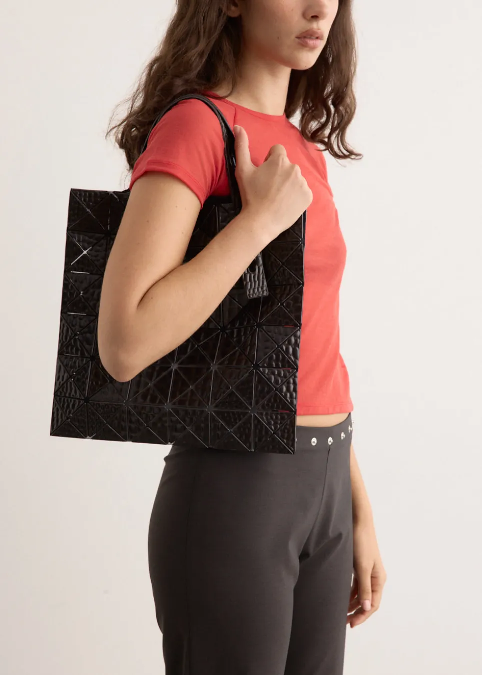 Introduced in 2000, Bao Bao is a part of the Issey Miyake label and captures the brand’s highly conceptual aesthetic of sculptural quality and bold colour palettes in a collection of small accessories and bags. The Kaiju 6×6 Tote Bag from Bao Bao’s ‘Playful’ series is inspired by fantasy creatures. Its unique texture resembles a kaiju (monster) and features grained triangular embossing, resulting in a dynamic interplay of light and shade.