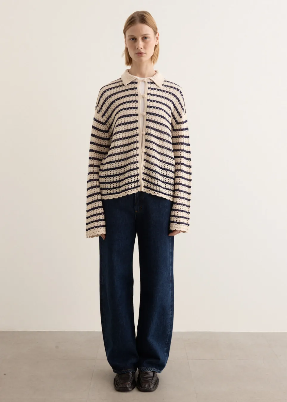 Celebrated for their cult urban collections, rag & bone’s modern wardrobe essentials are infused with a downtown-cool attitude. Crafted from a cotton and linen blend open knit, the Khloe Stripe Cardigan is cut to a relaxed fit, featuring a collared neckline and a loop button closure.