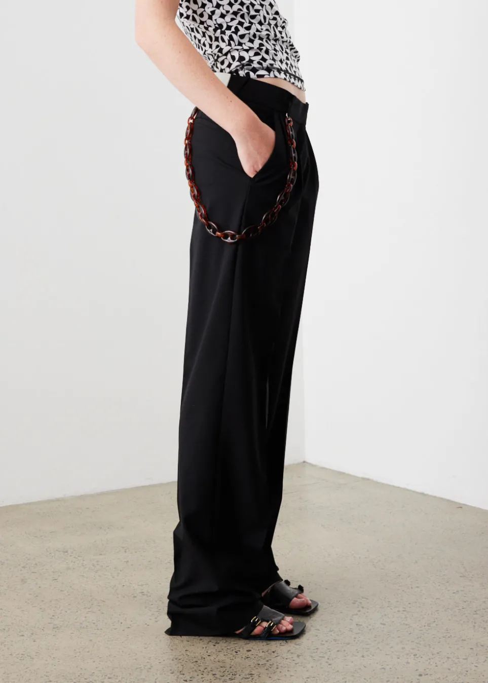 Coperni was established in Paris in 2013 by Sébastien Meyer and Arnaud Vaillant. The brand’s sleek version of minimalism is heavily influenced by the digital age, with a particular focus on asymmetry and structure. The Low Rise Loose Tailored Trousers sit at the hips, with a flattering drape and tortoise shell chain off the side. Pair with the High Neck Fitted Top and Roni Gloss Sandals.