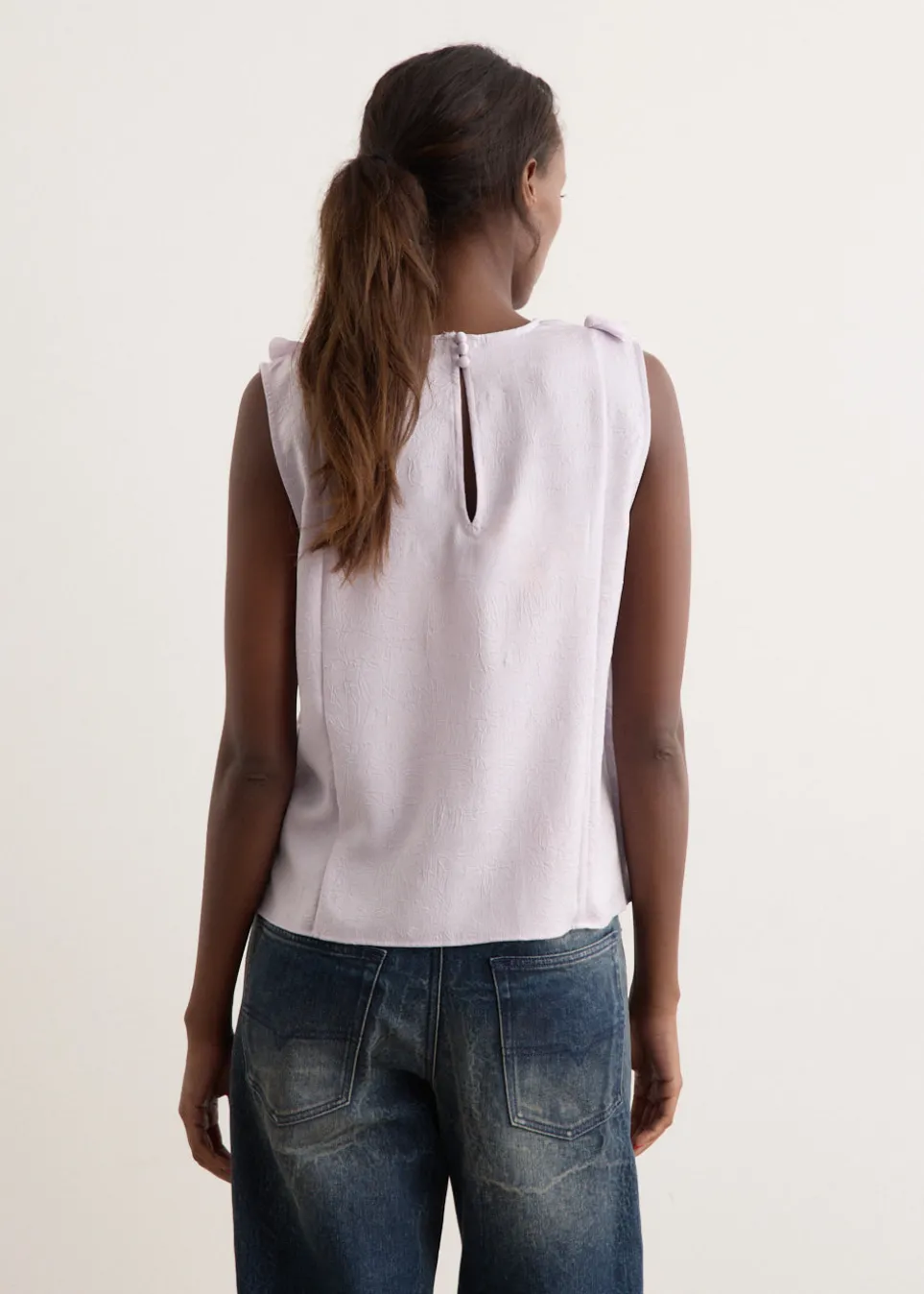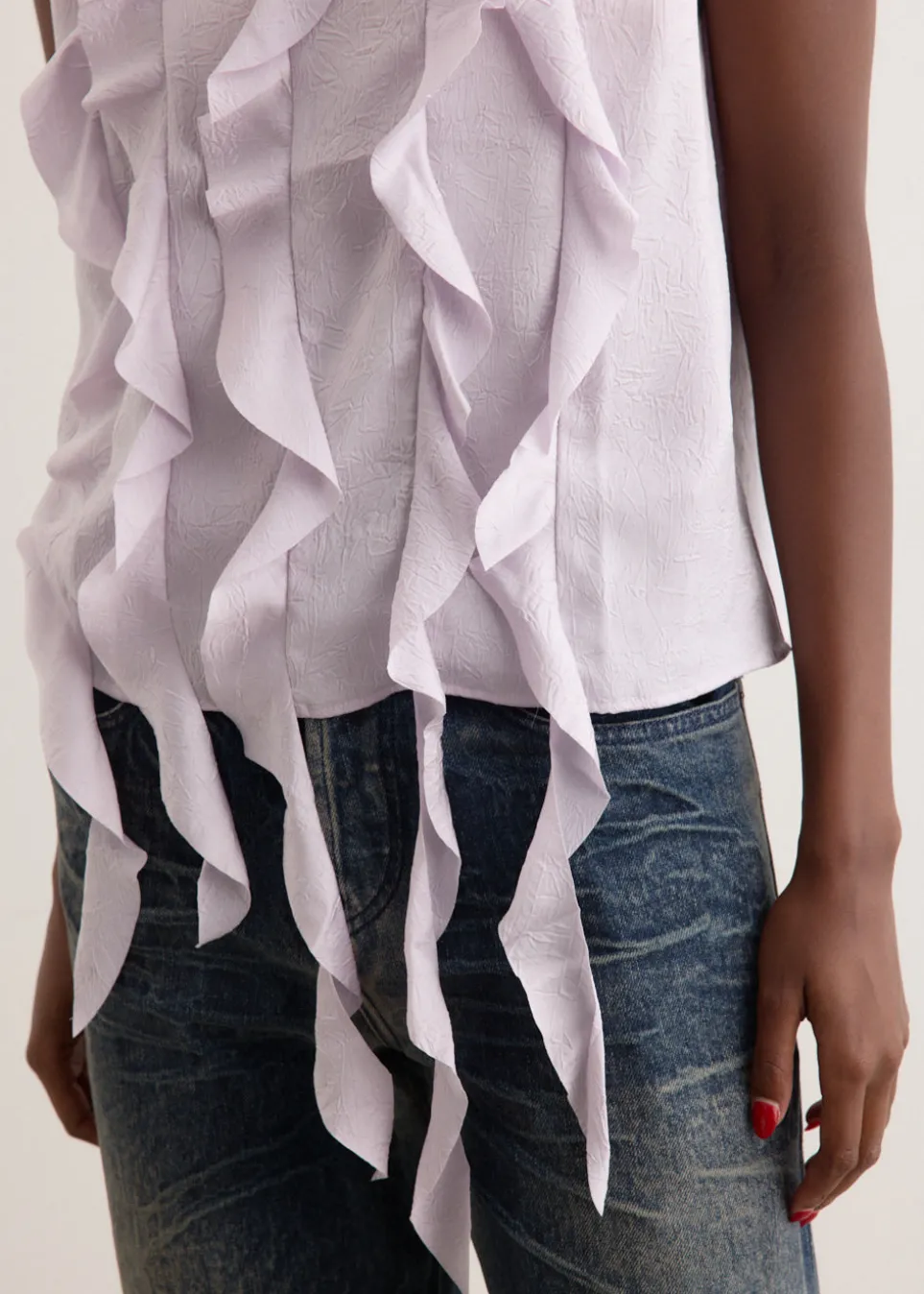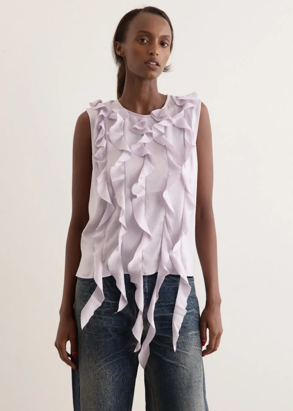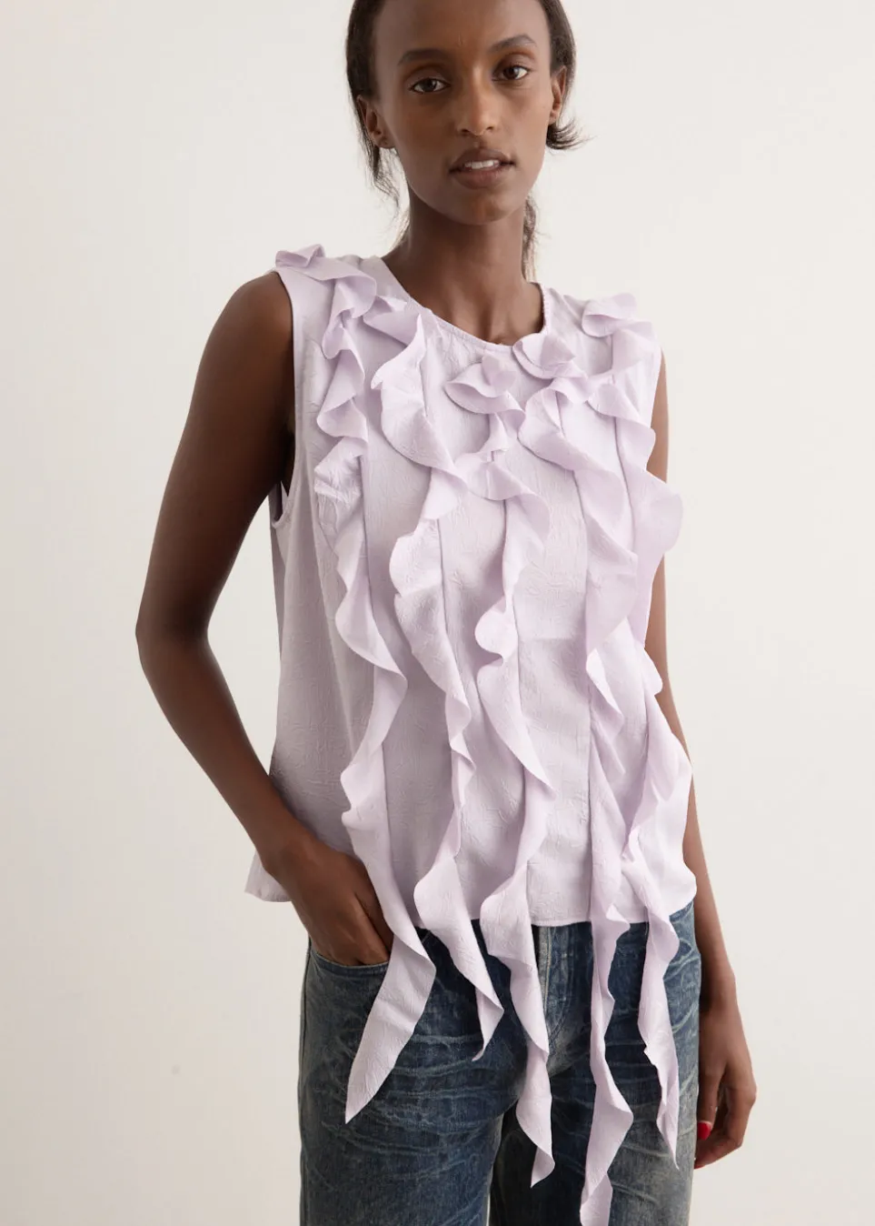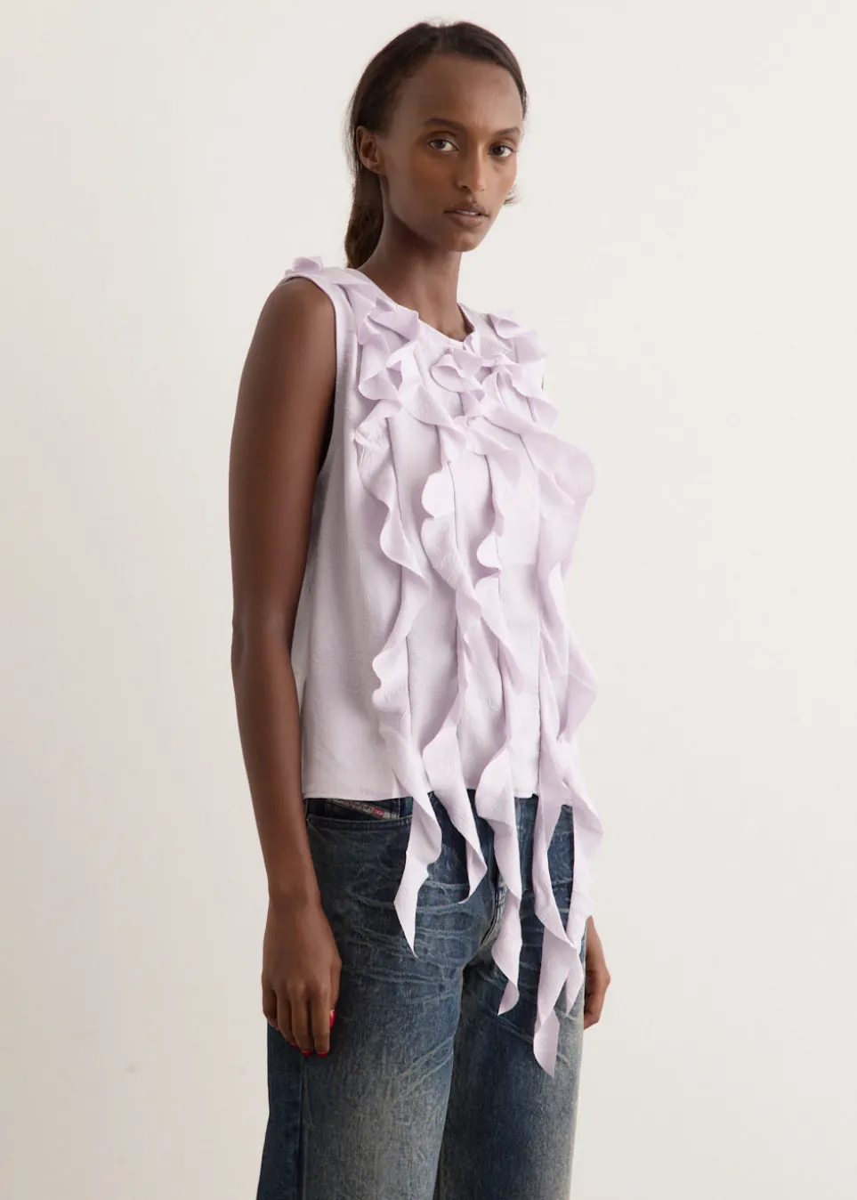 Brainchild of the designer duo Rikke Baumgarten and Helle Hestehave, Baum und Pferdgarten is the Danish label that blends modern feminine style with a playful sensibility. Crafted from lightweight recycled polyester, the Mavi Top is adorned with vertical asymmetric ruffles at the front that adds movement and playfulness to a classic straight-fit, sleeveless silhouette.