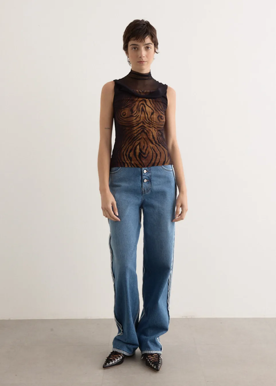 – High-neck sheer mesh layer