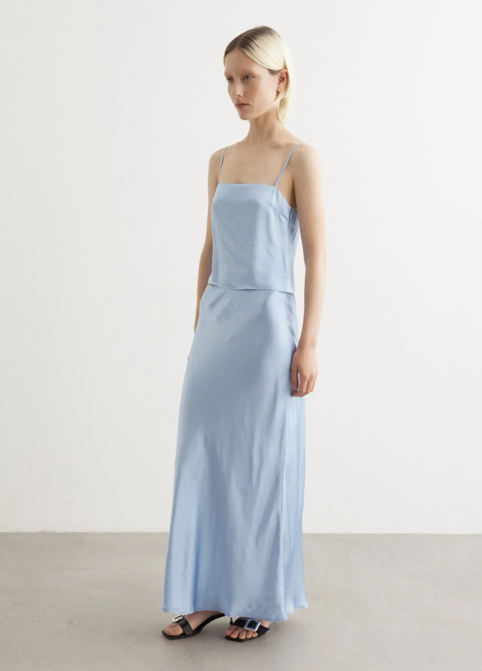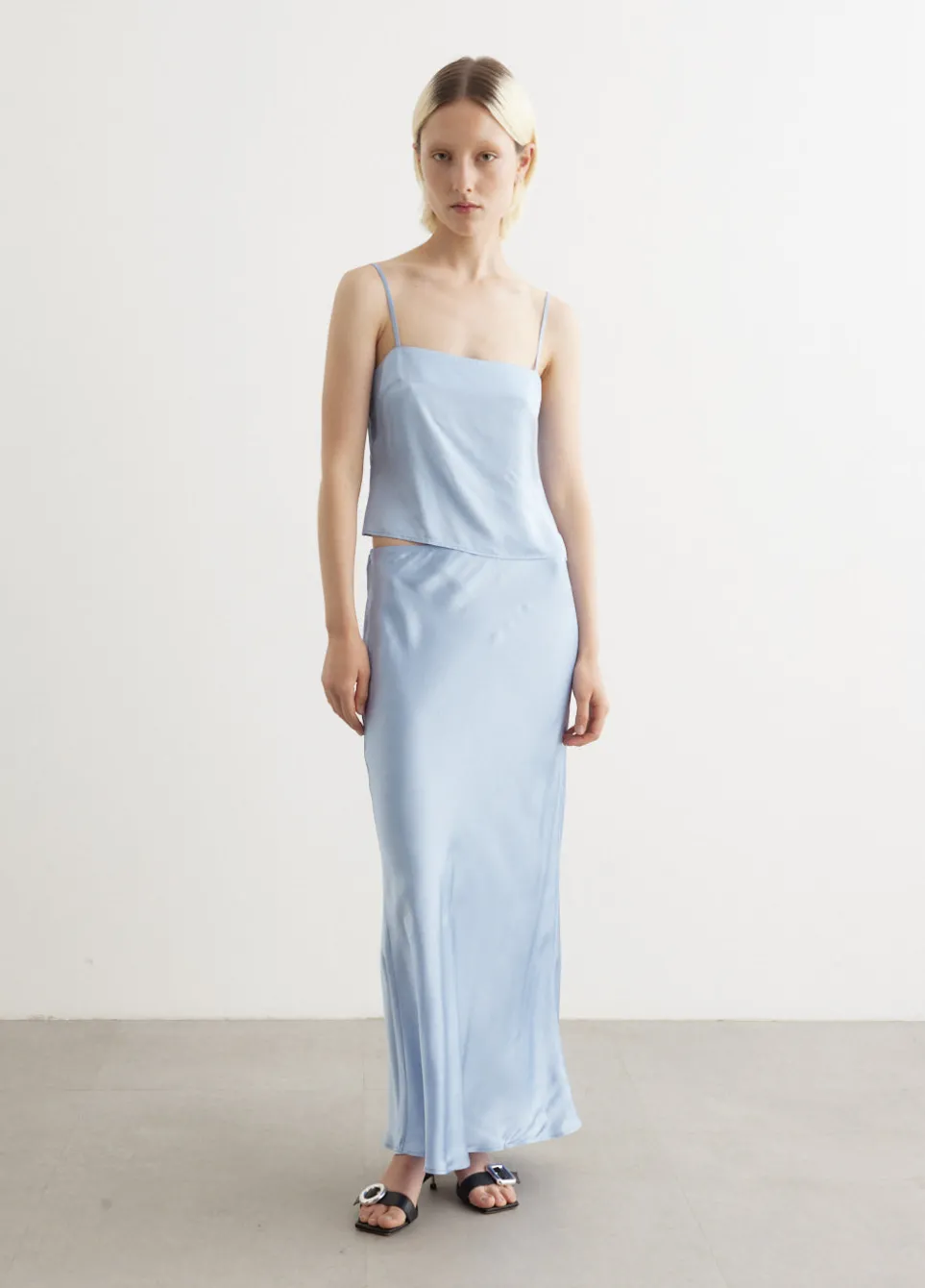 The California-based brand places vintage references at the heart of its design DNA, peppering its collection with ruched and ruffled details. Crafted from silky viscose, the Pauline Top flaunts simplistic elegance, featuring a square neck and spaghetti straps, detailed with darts for a flattering drape.