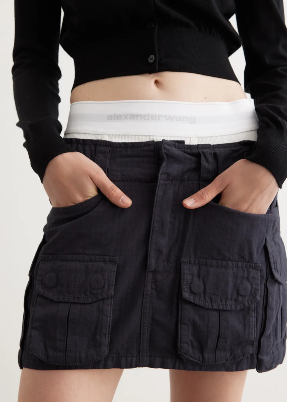 Inspired by elements of New York nightlife and street culture, accessories and apparel from Alexander Wang are instant icons. Adorned with shimmering rhinestone embellishments and branded details, each piece in the collection sparks youthful spirit and urban attitude. Crafted from a cotton blend, the Pre-Styled Cargo Skirt With Logo Elastic features a logo brief waistband and multiple cargo pockets.