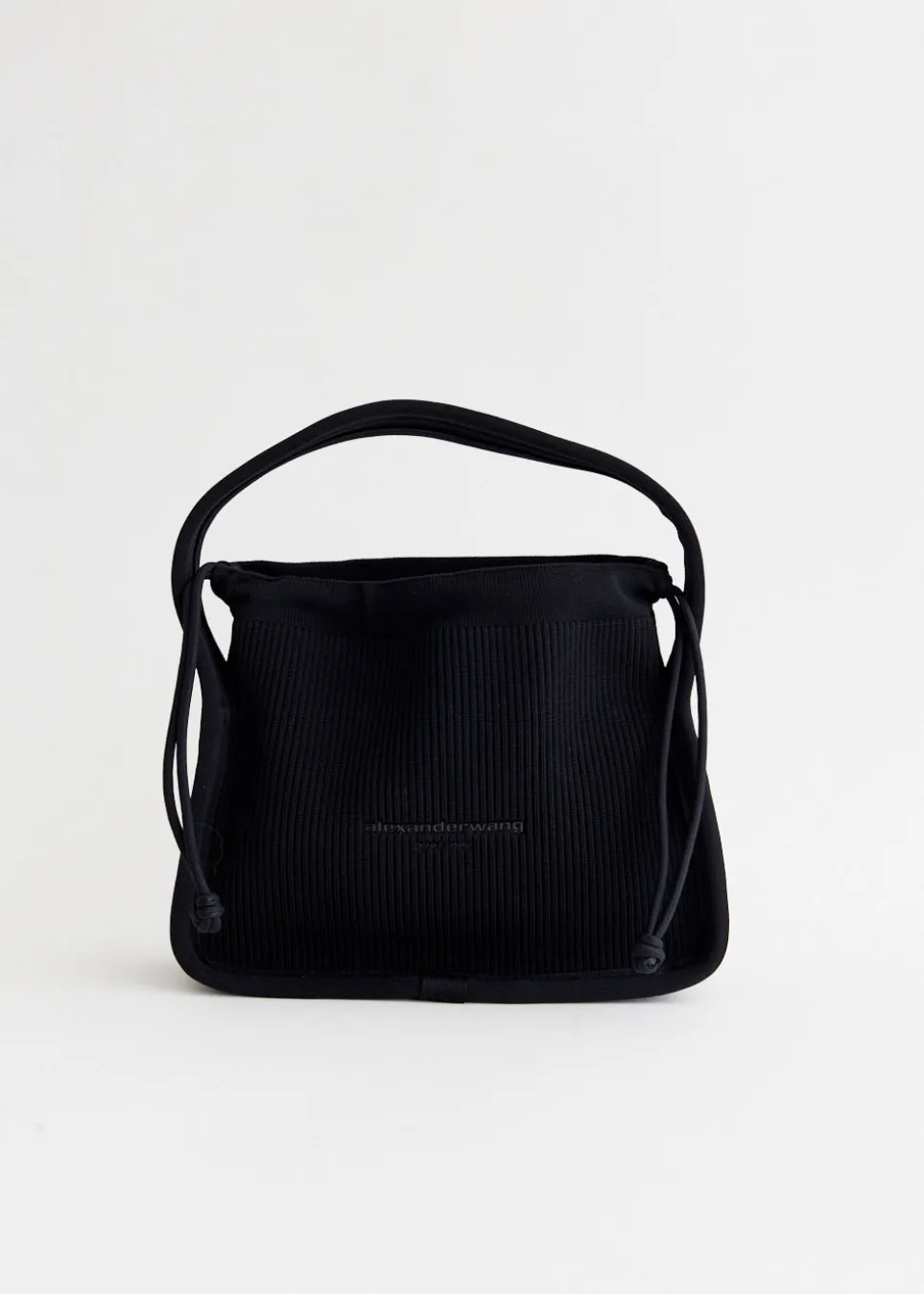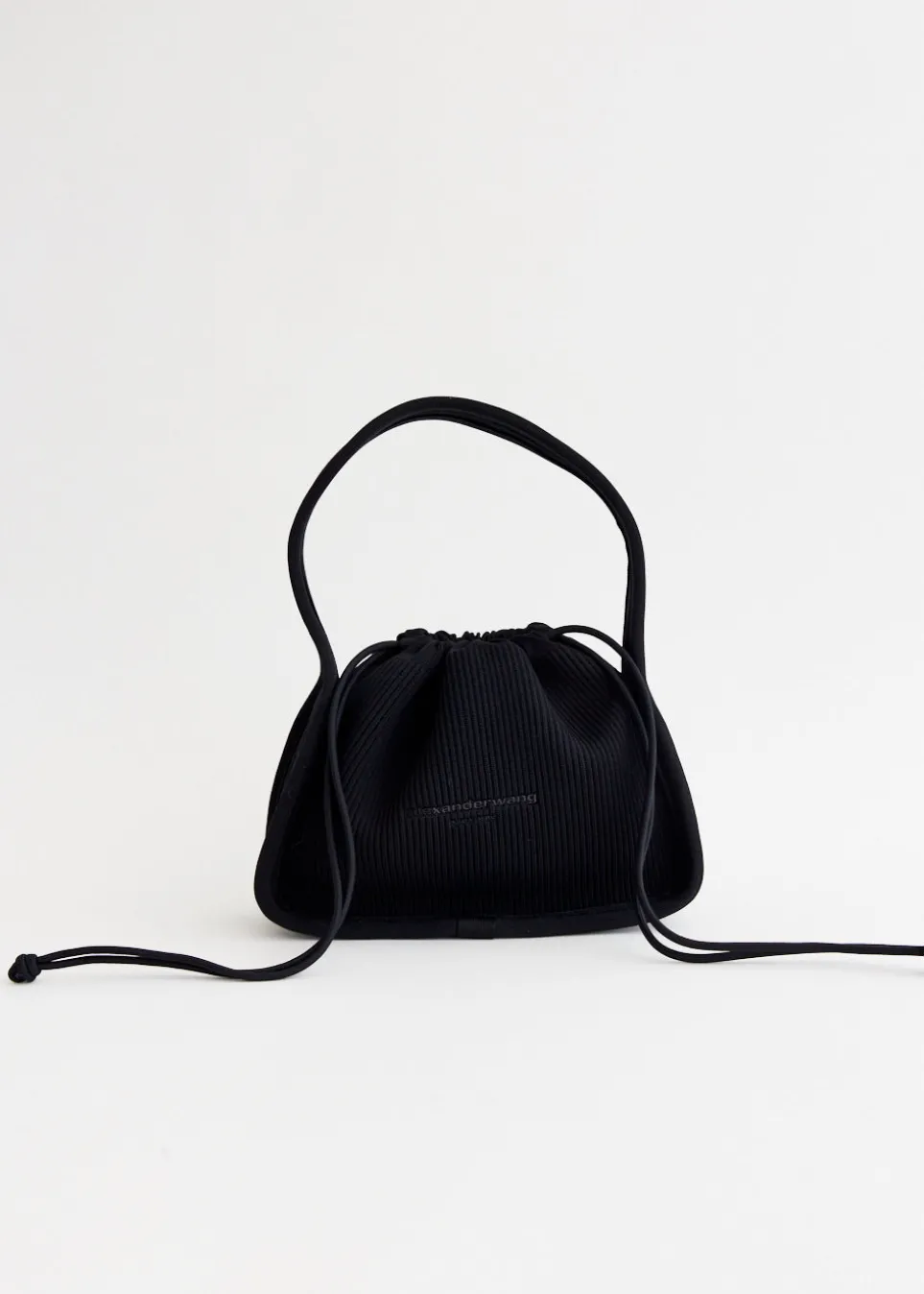 Inspired by elements of New York nightlife and street culture, Alexander Wang’s accessories are instant icons. Adorned with shimmering rhinestone embellishments and branded details, each piece in the collection sparks youthful spirit. Crafted from a polyester-nylon blend with a ribbed texture, the Ryan Small Bag features a ribbed texture and a convenient drawstring top closure. Its front is adorned with a printed logo, adding a touch of branding.