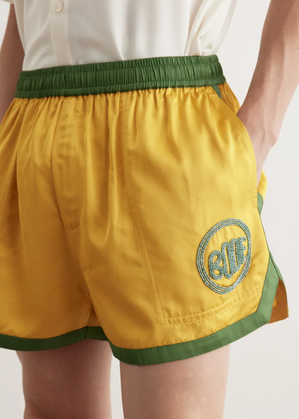 When Emily Adams Bode founded her eponymous label, Bode (pronounced Boh-dee), she did so with the intention of expressing a sentimentality for the past through her creations. The Satin Gym Shorts are a 1960s-inspired reproduction, featuring a contrast waistband and trim, with a beaded Bode logo on the front hem.
