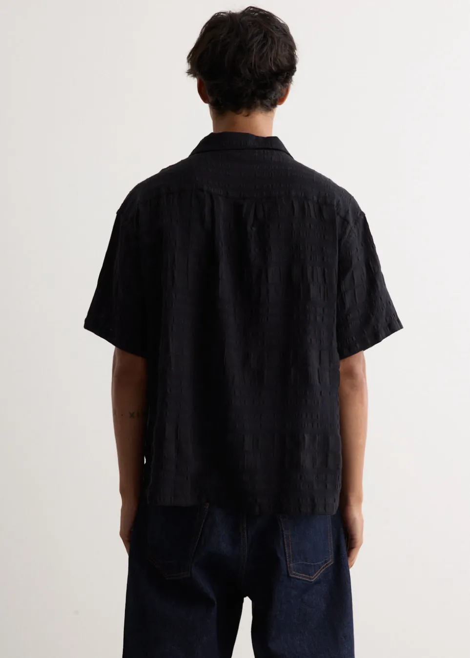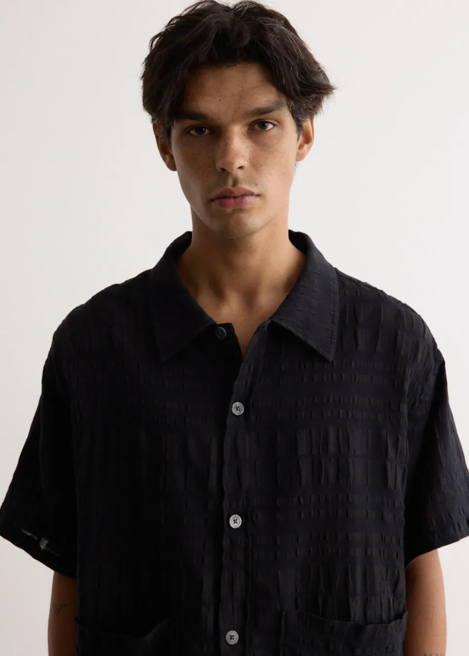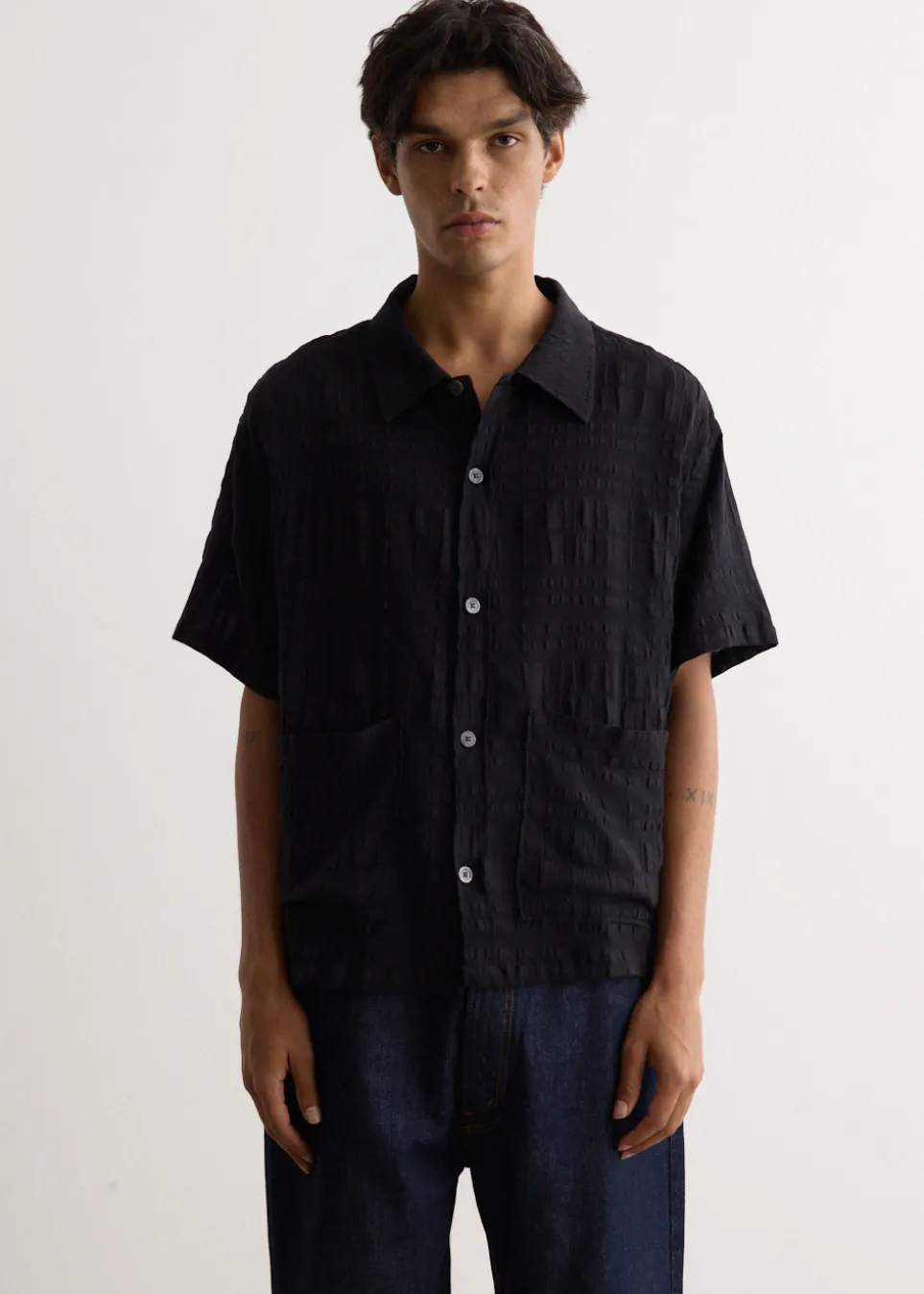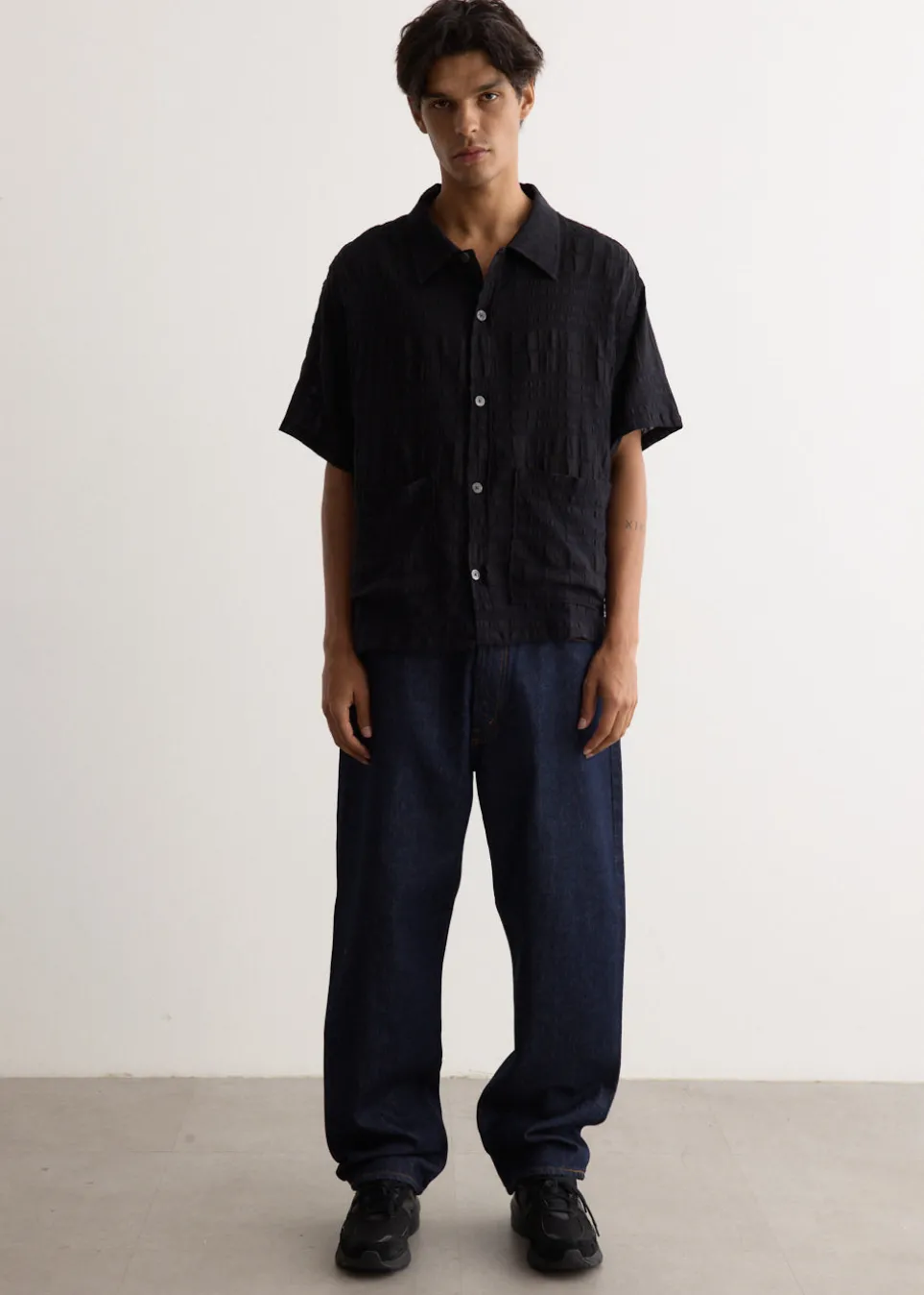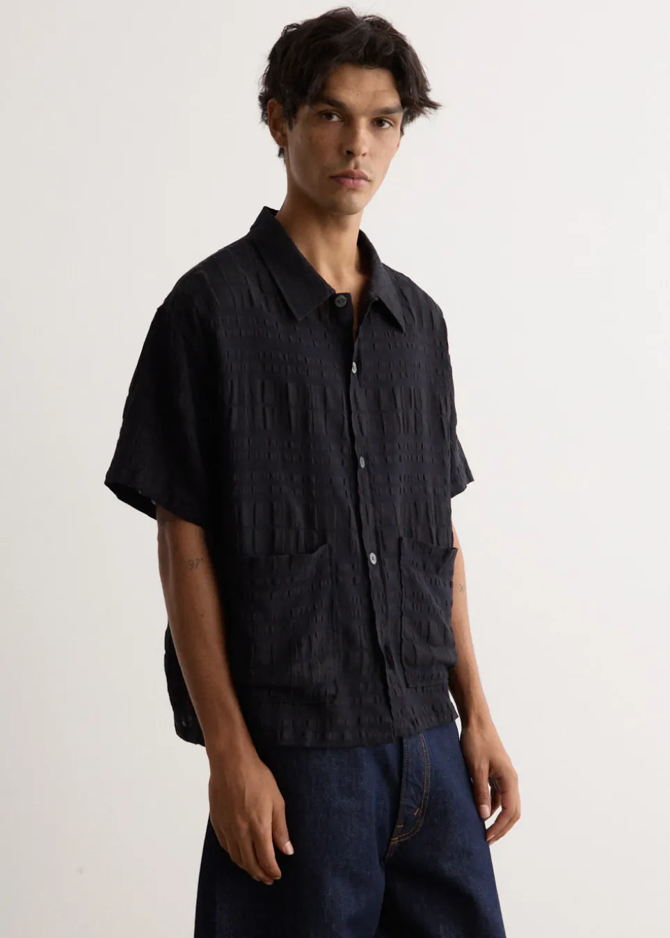 Copenhagen-based brand mfpen meticulously focuses on upcycling and conscious production. Crafted from a textured lightweight cotton and linen blend, the Senior Shirt is cut to a relaxed and boxy fit, featuring drop shoulders, a front button placket, back yoke pleats and patch pockets.