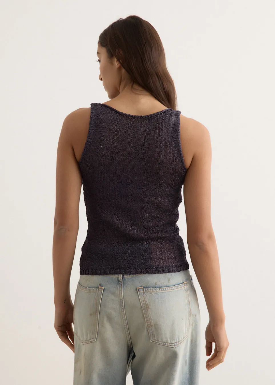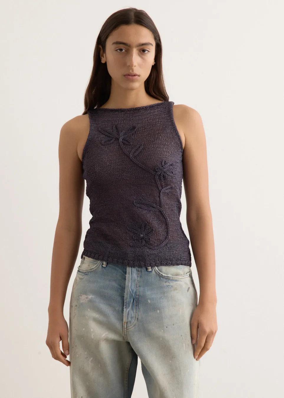 Barcelona-based brand Paloma Wool is renowned for its artisanal quality, retro silhouettes and the art of getting dressed. The Skipp Top is a sleeveless fitted top in a mid-weight, slightly shiny tricot knit fabrication. Featuring a boat neckline and a front tonal 3D embroidery.