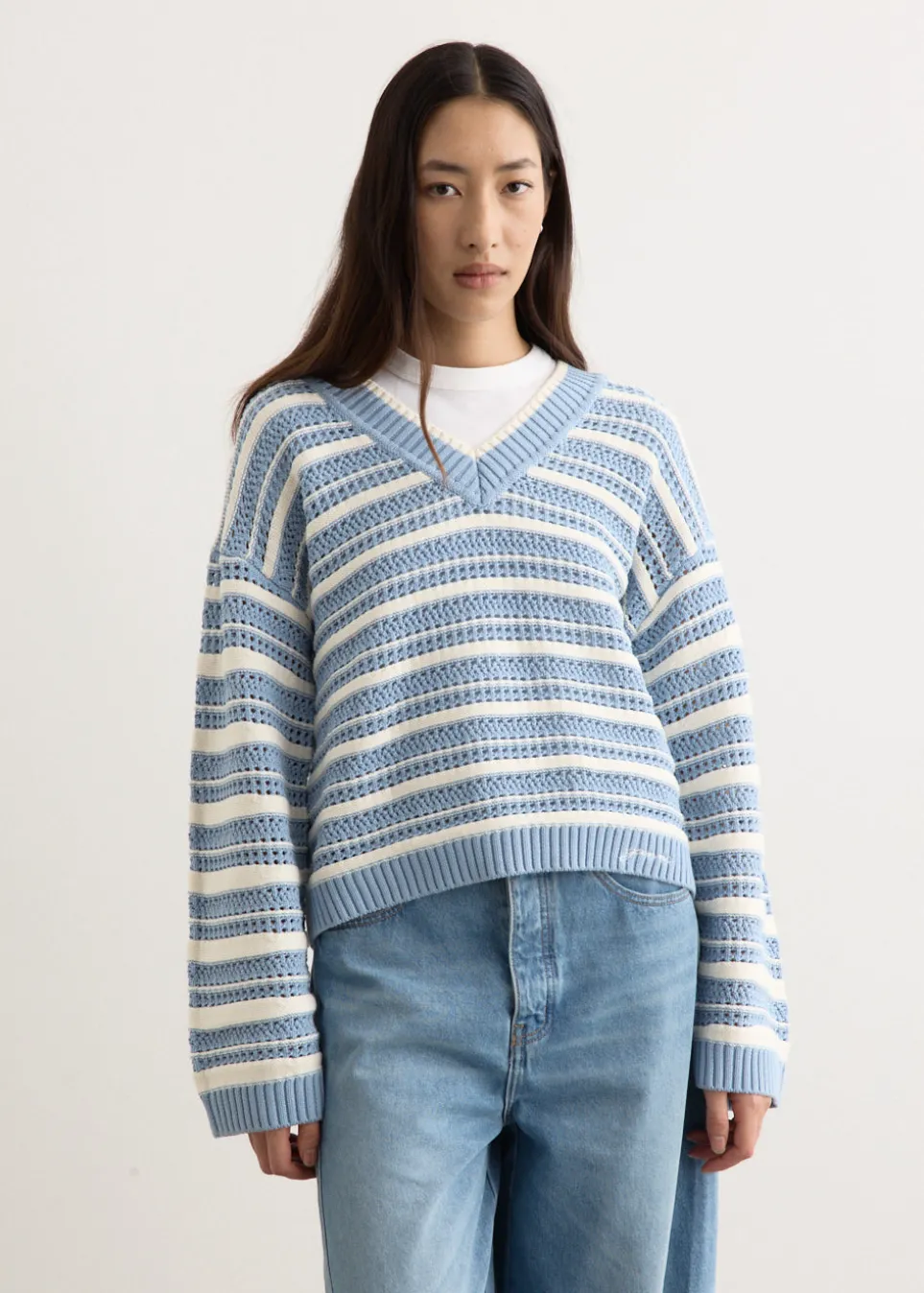 Danish label Ganni blends streetwear trends with a playful touch of humour through bold prints and colour palettes, voluminous silhouettes and easy-to-wear fabrics. Knitted from cotton, the Striped Cotton Pointelle V-Neck is cut to a relaxed fit and is complete with an embroidered logo on the hem.