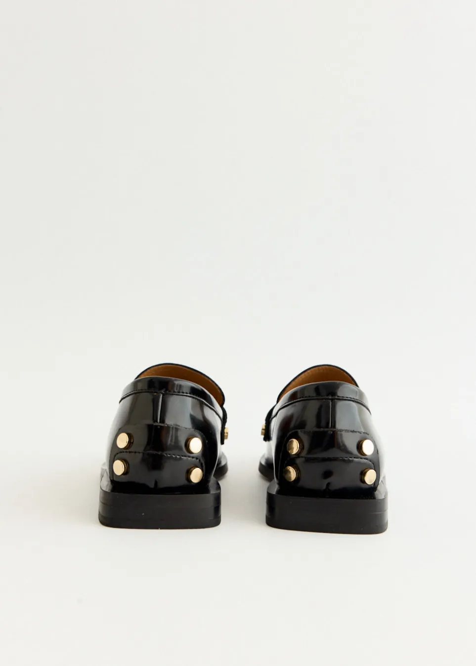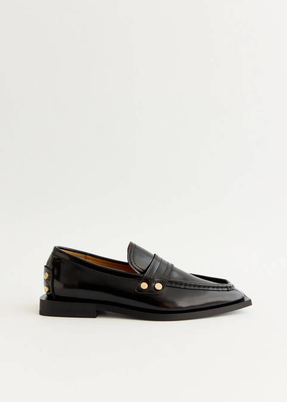 Danish label Ganni blends streetwear trends with a playful touch of humour through bold prints and colour palettes, voluminous silhouettes and easy-to-wear fabrics. Crafted from Oleatex with a glossy finish, the Studs Square Toe Loafers boasts a classic design with modern details. Featuring a square toe, detailed with gold studs at the back, offering a subtle edge to a timeless silhouette.
