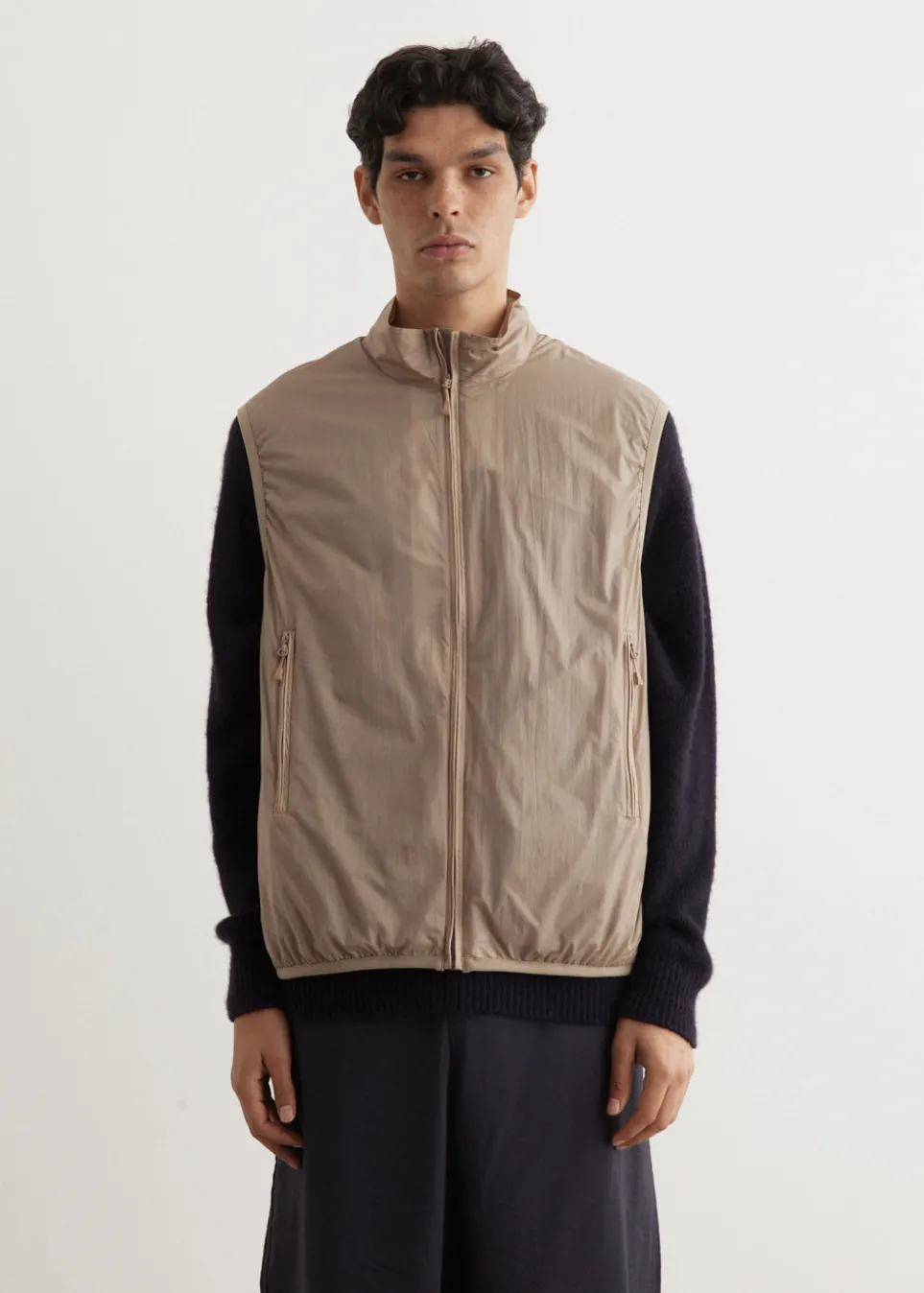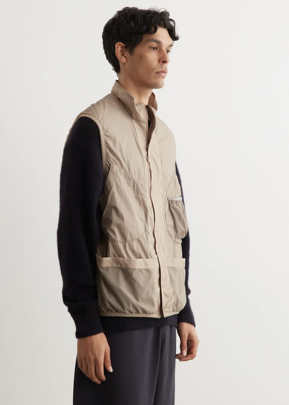 Japanese-label DAIWA presents a concept of a “seamless bridge between the great outdoors and the city” with a collection of clothing combining a modern sensibility of urban style and of fishing apparel. The Tech Reversible Wind Shield Vest Jacket is made with nylon. It features a panelled design and rib knit trim throughout.
