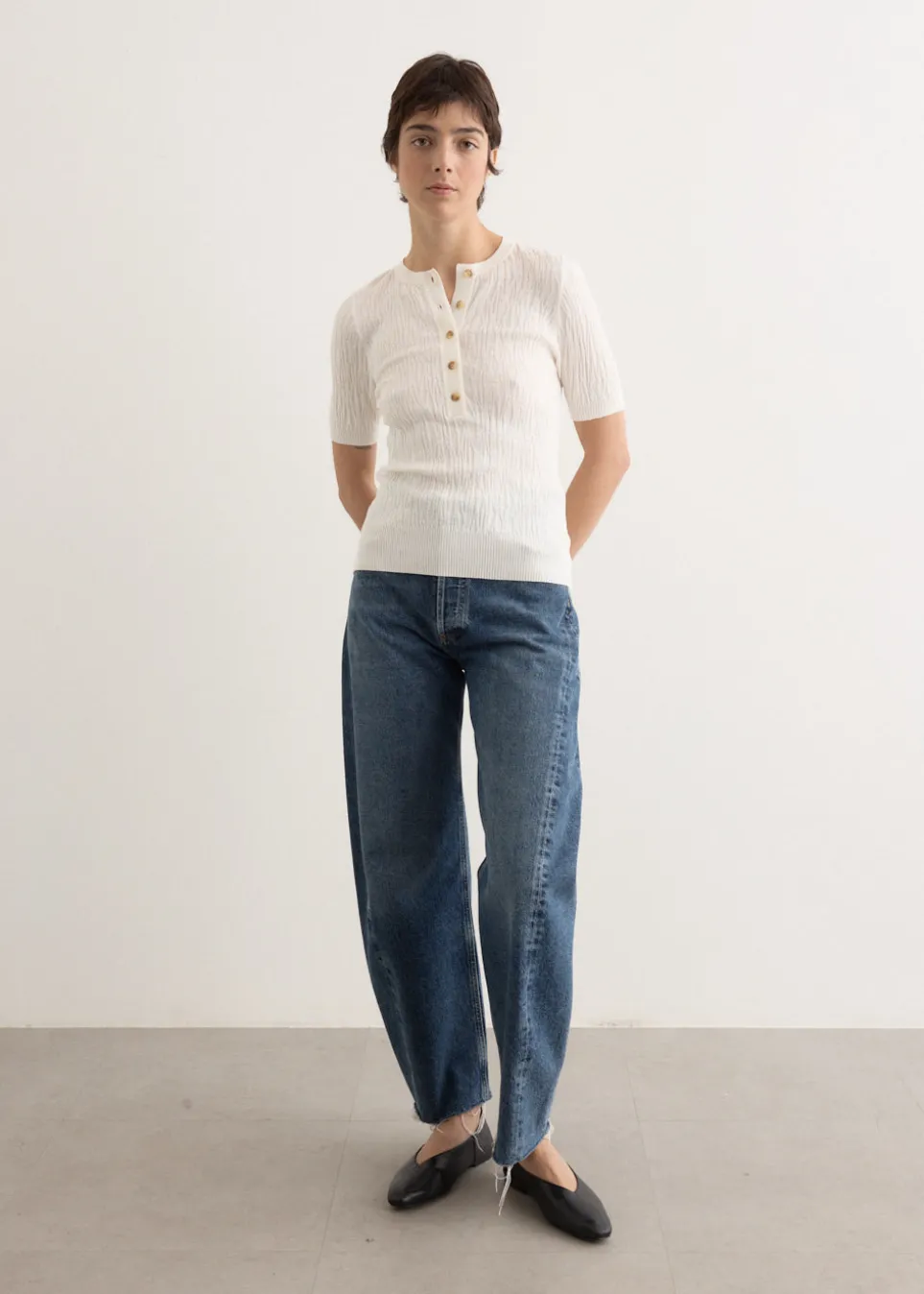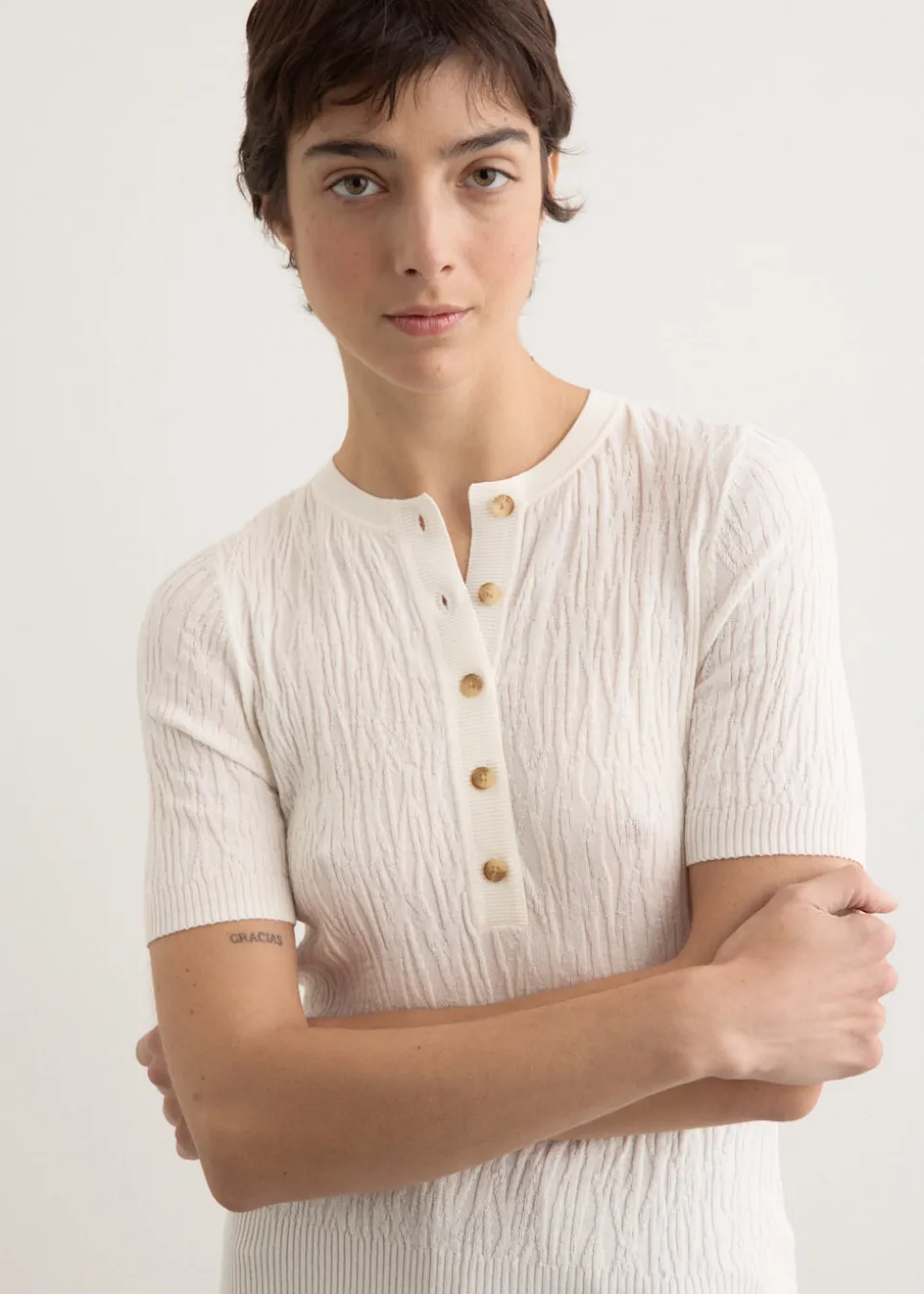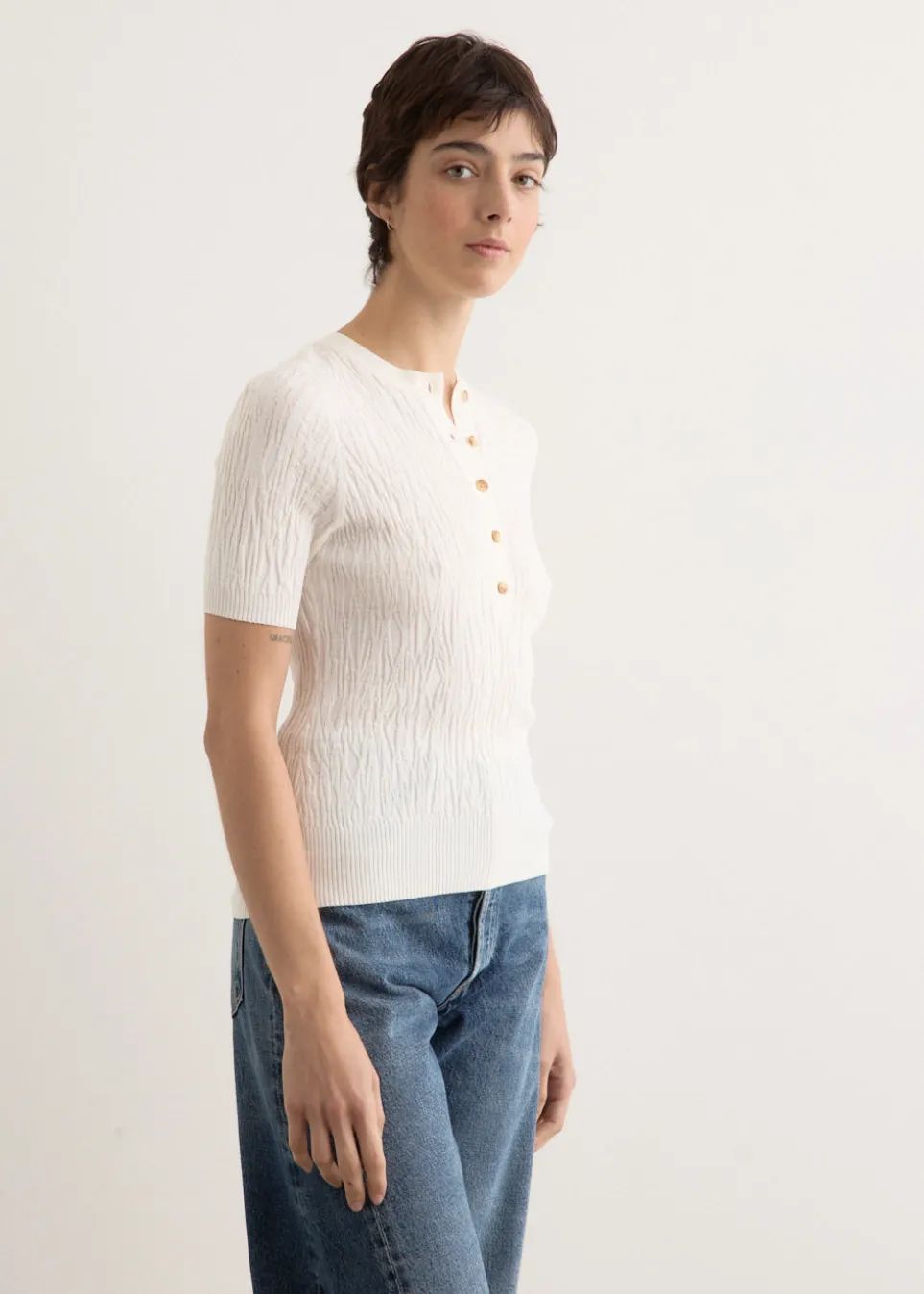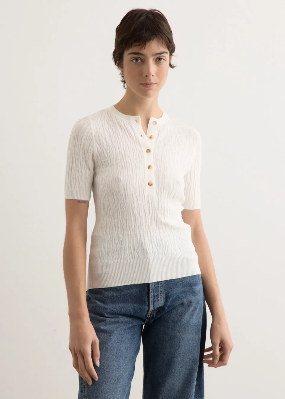 ANNA QUAN is an Australian fashion brand started by Anna Hoang in 2013. The brand highlights the art of capsule dressing by offering timeless silhouettes and essential wardrobe staples. Its collections combine classic design and understated luxury, reflecting a commitment to lasting style and quality craftsmanship. Made from a textured eco-stretch viscose-nylon blend, the Vali Top is a short-sleeve knit made featuring a button-up front, round neckline, and ribbed detailing for a breathable, durable finish.