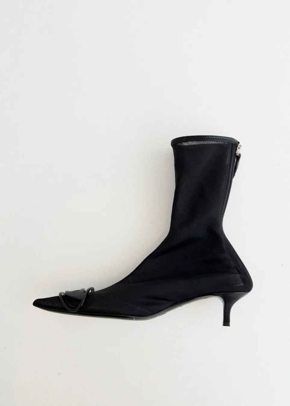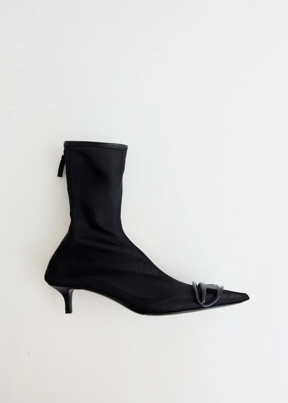 Founded in 1978, Diesel is rooted in denim mastery, known for their nostalgic Y2K-inspired pieces to create a chic yet casual look. Made from a stretch mesh upper, the Venus D-Venus Kittie Boots ensures a comfortable, sock like fit. Featuring a sharp pointed toe silhouette, embellished with a glossy Oval D hardware at the front.