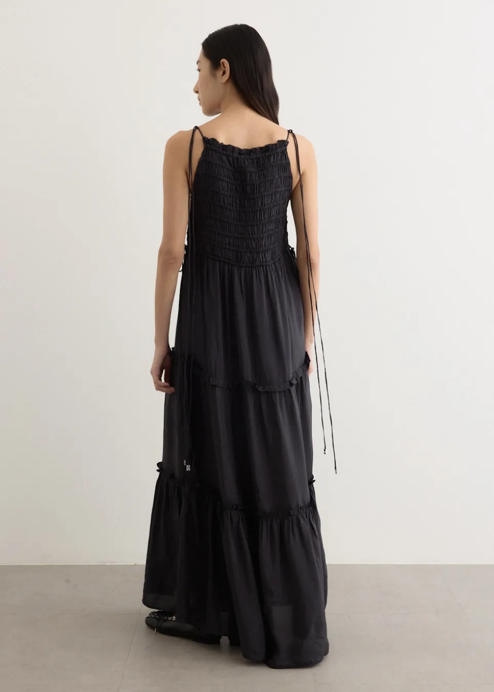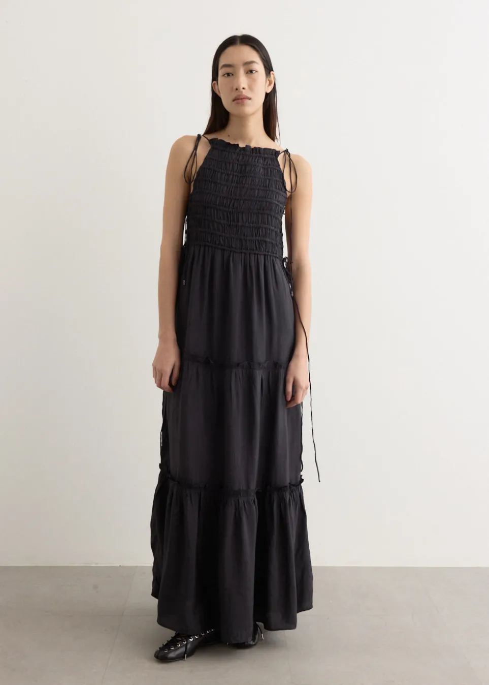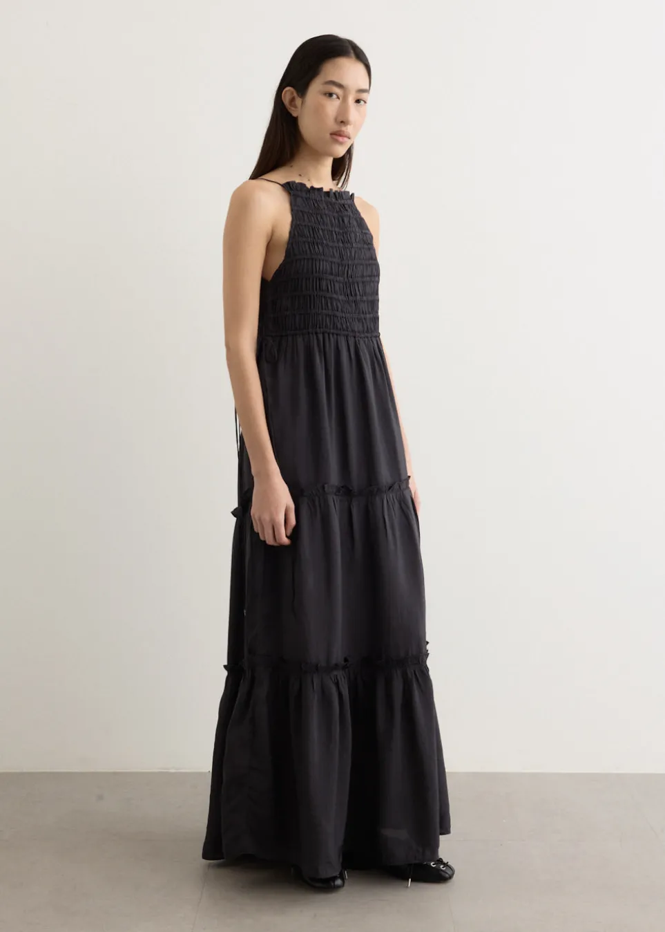 Danish label Ganni blends streetwear trends with a playful touch of humour through bold prints and colour palettes, voluminous silhouettes and easy-to-wear fabrics. Crafted from viscose habotai, this maxi dress is a versatile warm weather essential. Featuring a high neckline, textured tiered skirt design and adjustable ties, the dress offers a fluid and sophisticated silhouette suited to all occasions.