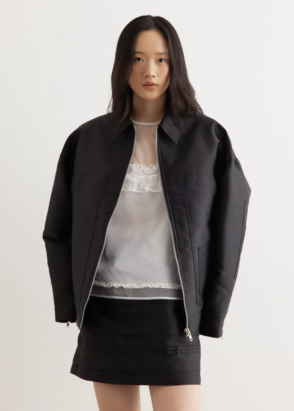 Cecilie Bahnsen partners with Nona Source to create a limited apsule collection, crafted from LVMH’s deadstock fabrics. The collaboration celebrates a shared dedication to sustainable design, reimagining iconic silhouettes and responsible craftsmanship. Crafted from a polyester-silk blend, the Olpa Jacket is an oversized piece with a zip closure and front patch pockets. Its timeless design blends style and functionality effortlessly.