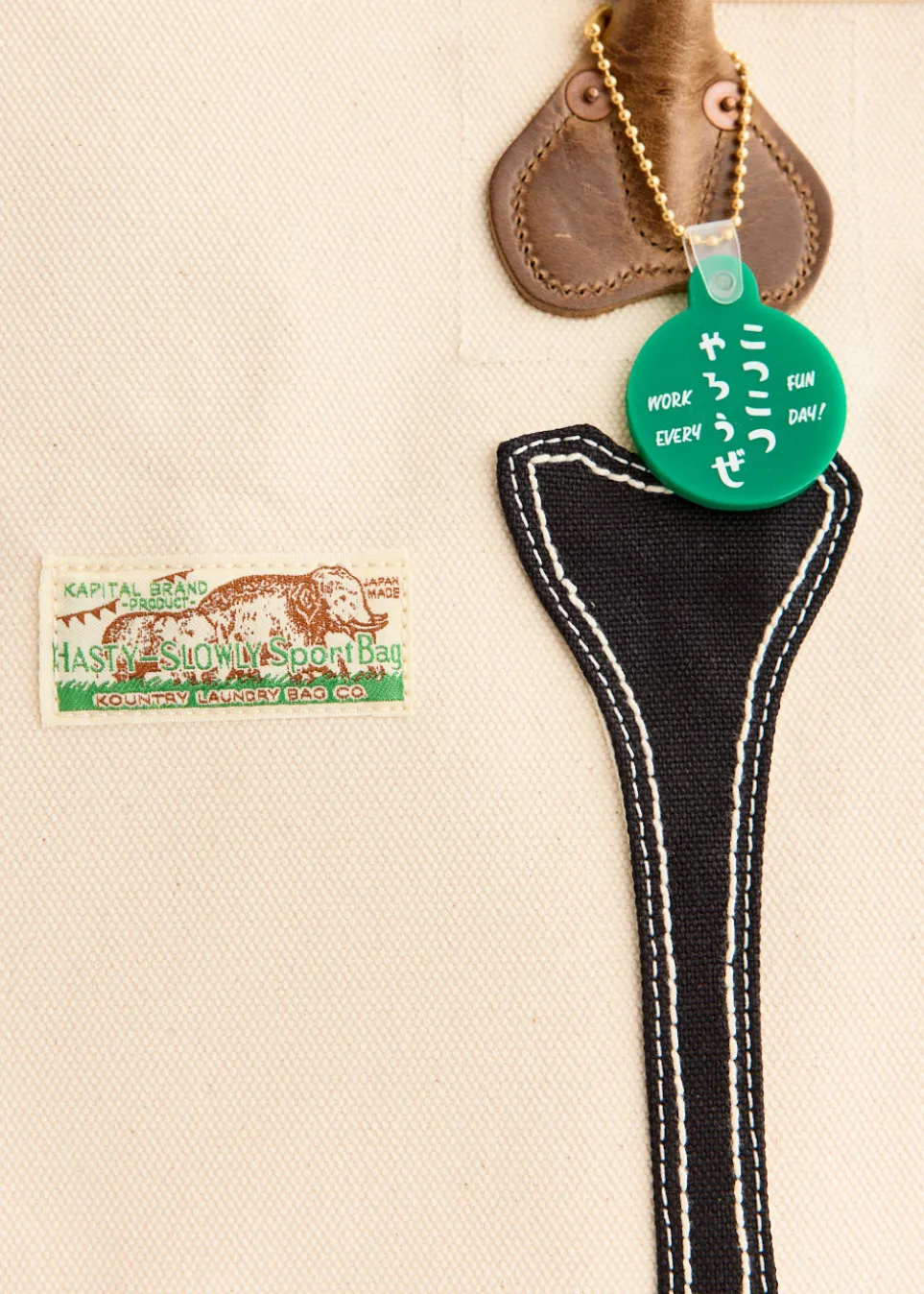 Paying homage to its hometown Kojima, Okayama – an area dubbed Japan’s denim capital – Kapital creates workwear-inspired pieces with a distinct edge. Crafted in Japan from a durable No.4 cotton canvas, the #4 Canvas KO.TSU.KO.TSU. Tote Bag (S) features leather top handles and a playful bone design. Finished with a tag on the front and a keychain accessory on the handle.