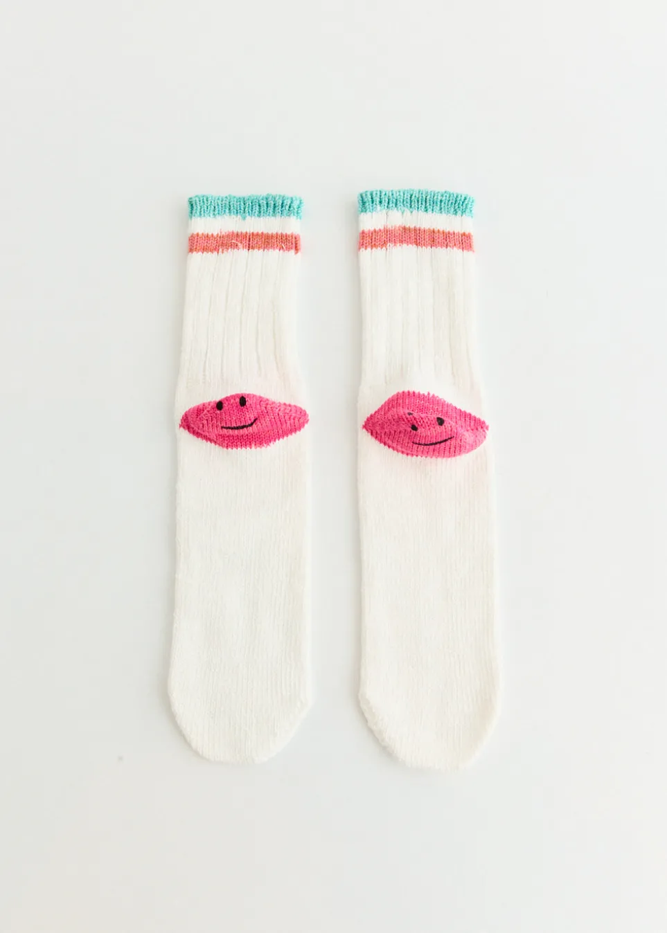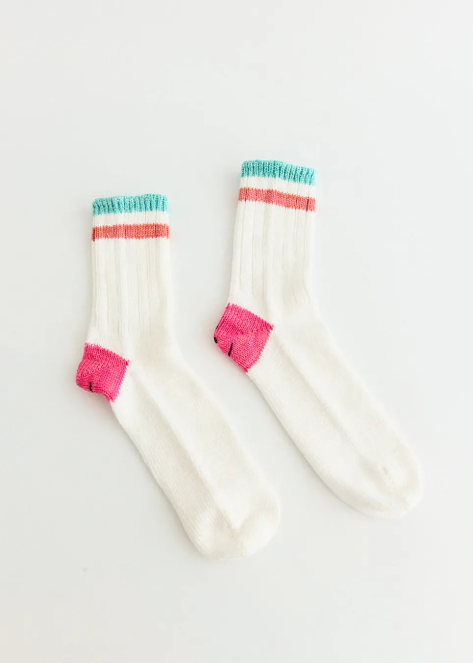 Paying homage to its hometown Kojima, Okayama – an area dubbed Japan’s denim capital – Kapital creates workwear-inspired pieces with a distinct edge. The 60 Yarns IVY RAINBOWY HAPPY HEEL-Hold Socks have contrasting accents and are made from a thick, soft cotton blend knit.