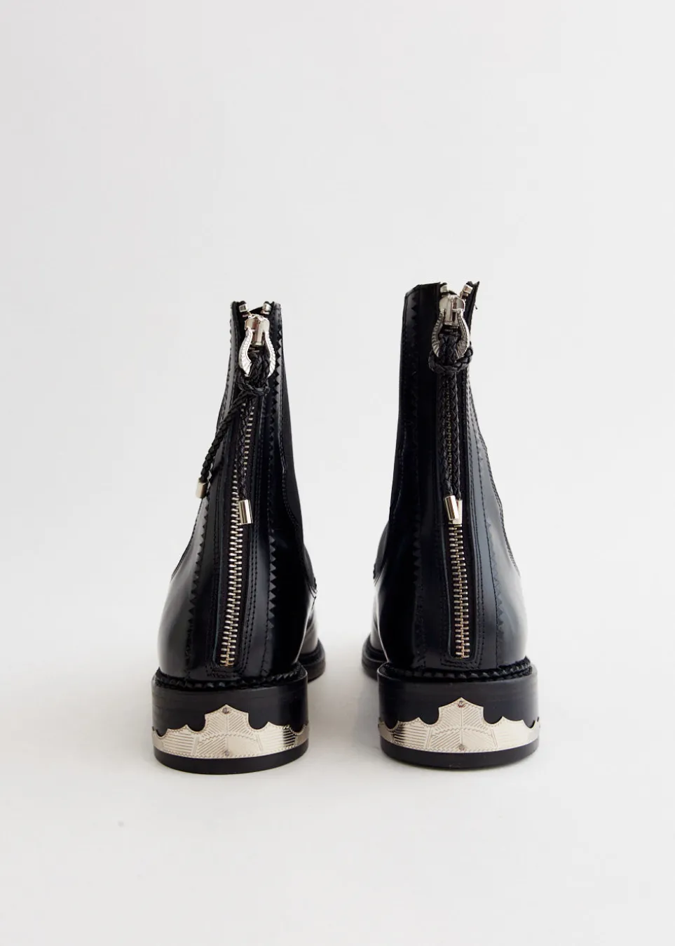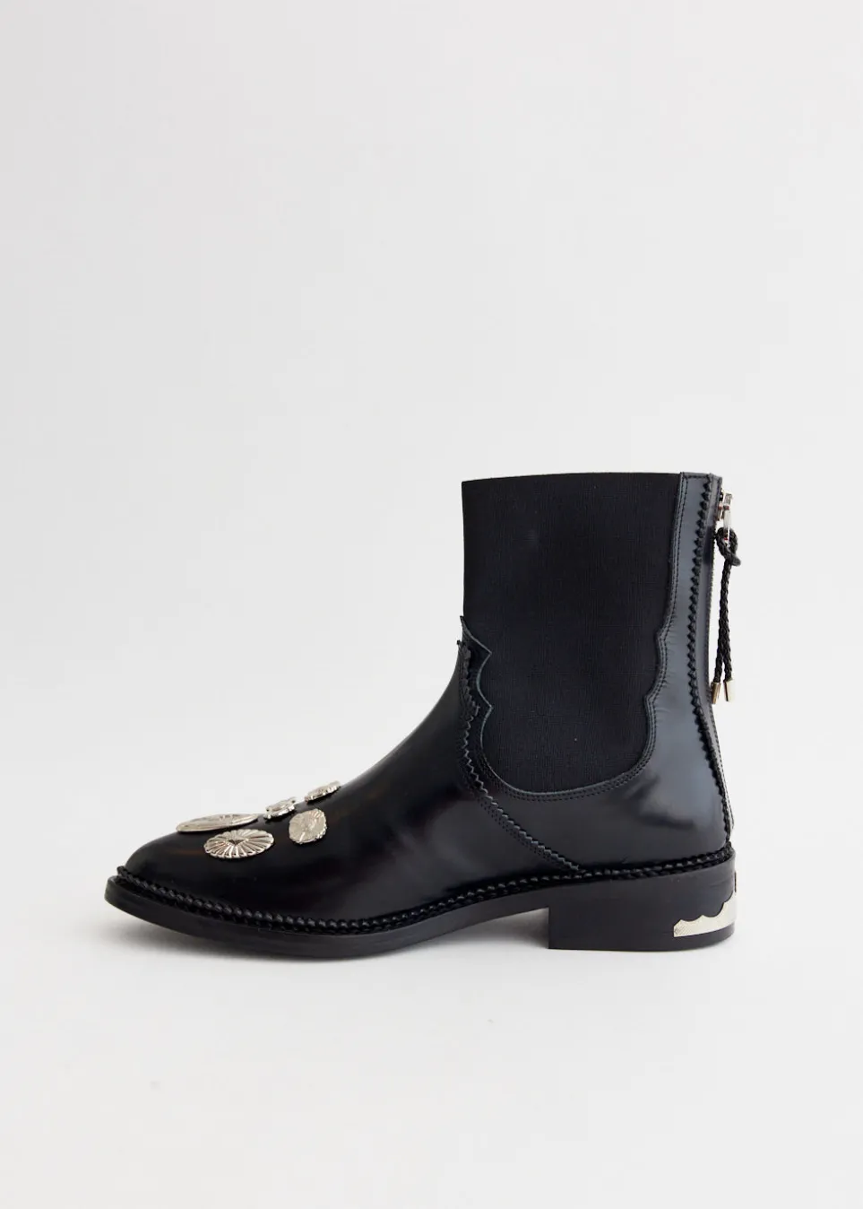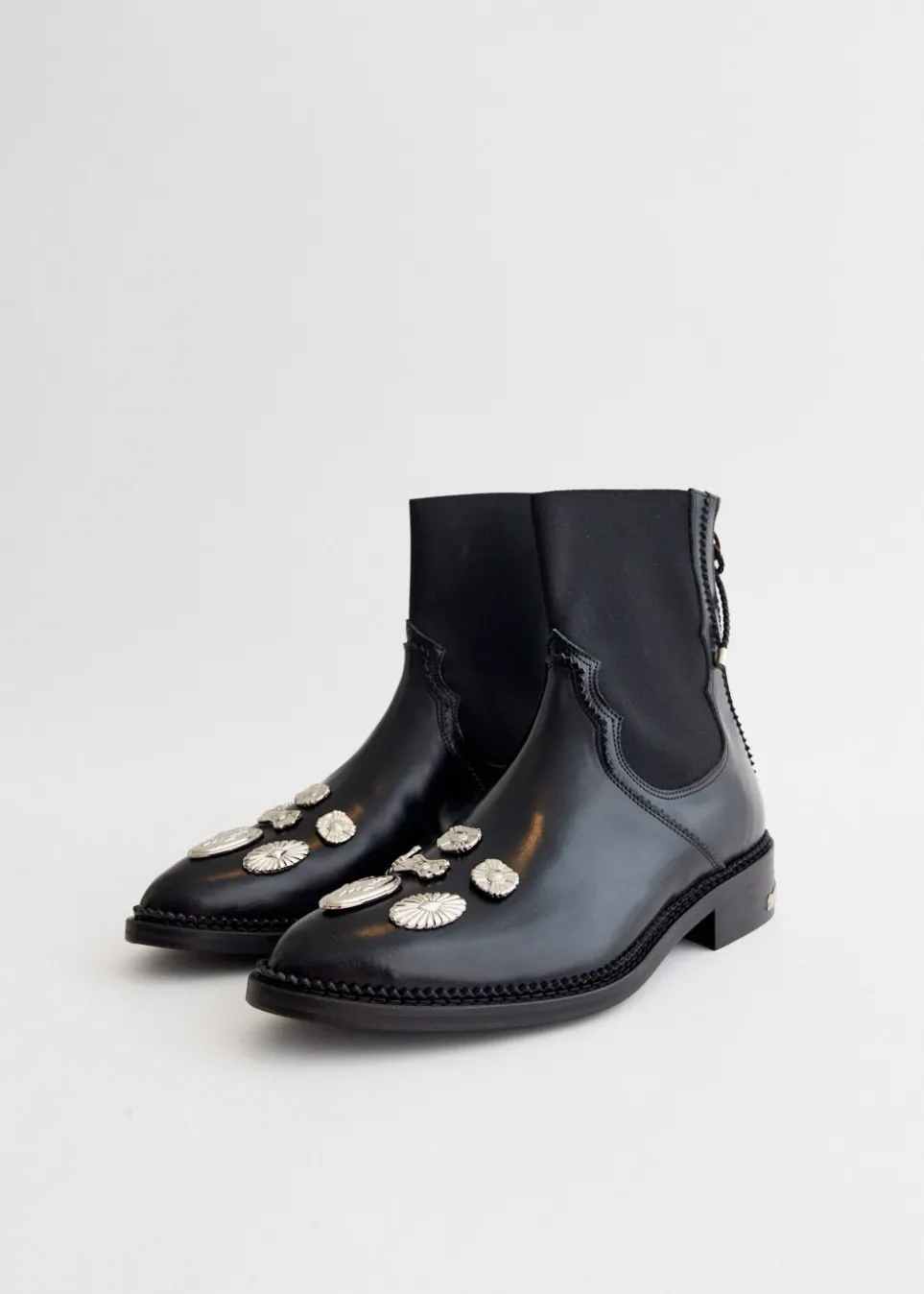 Yasuko Furuta launched menswear shoe capsule Toga Virilis under the main label’s signature guise of craftsmanship and now has introduced a womenswear range under Toga Pulla. Traditional silhouettes are updated with Western flair and vintage verve as derby shoes and loafers are detailed with textured panels, cutout details and statement hardware. The AJ990 Boots are a comfortable ankle-high boot with an elasticised collar gusset. The front is adorned with silver-tone hardware for a branded touch.