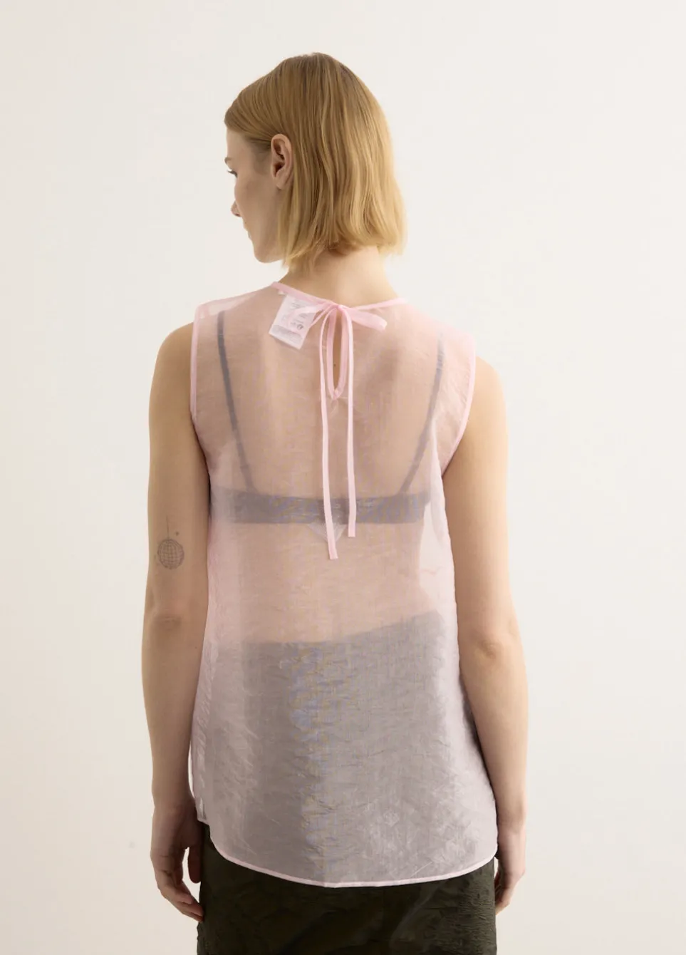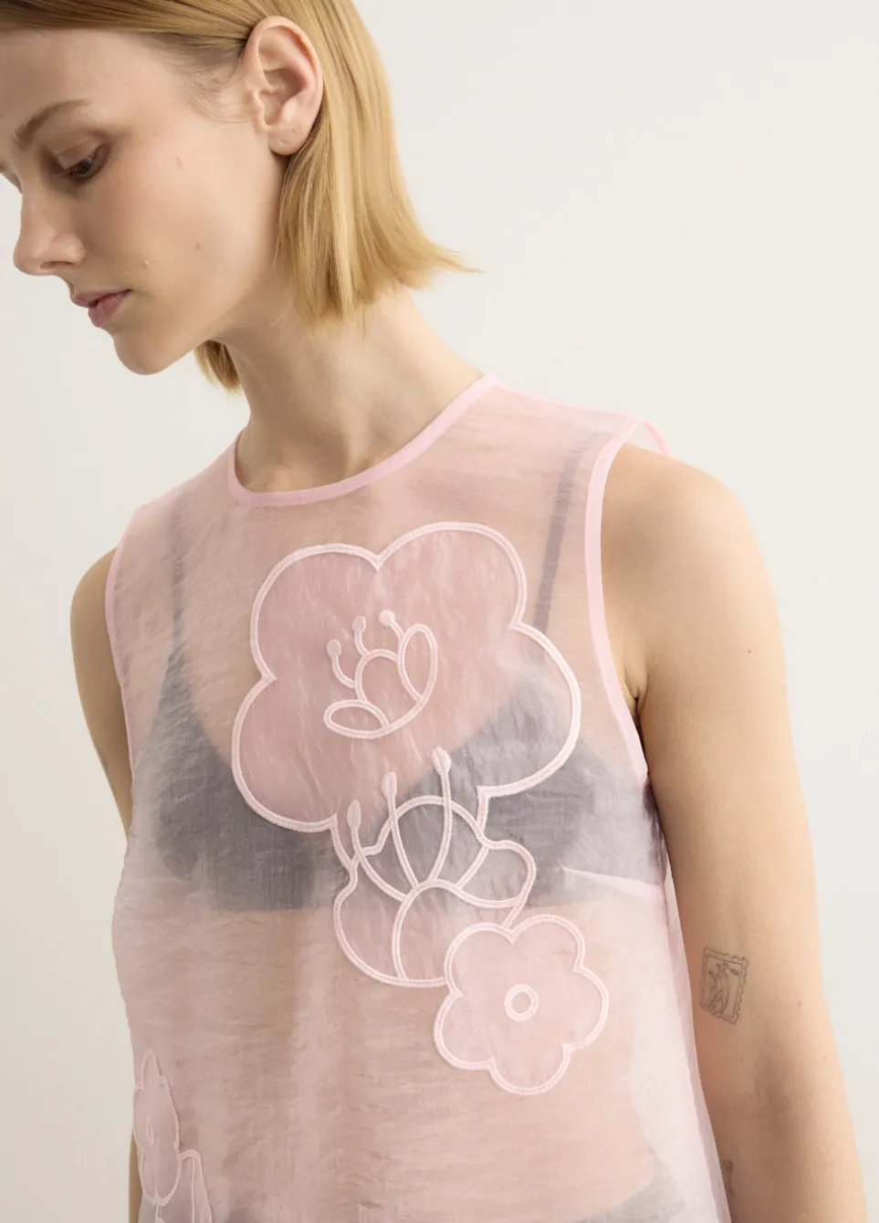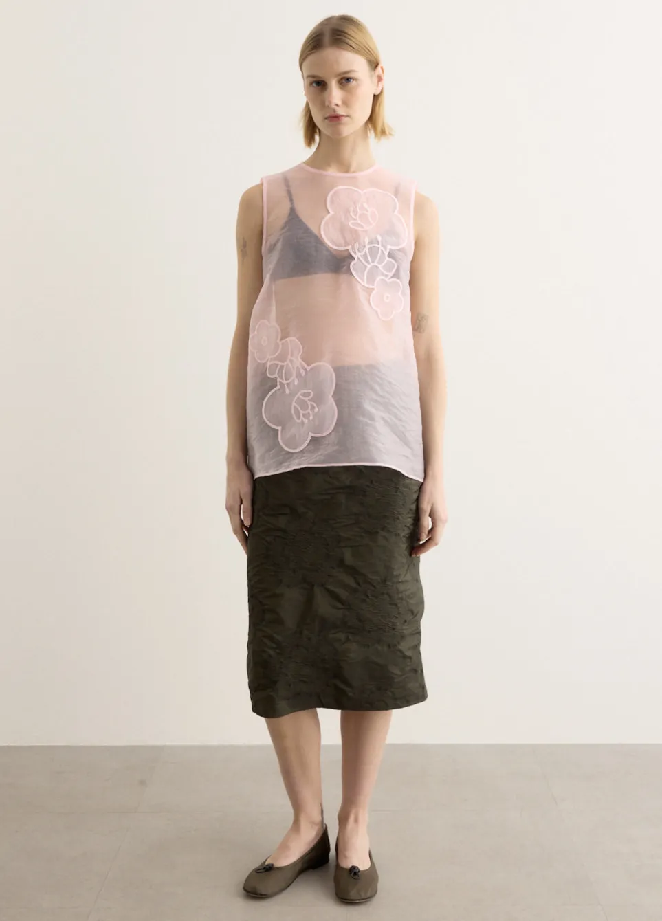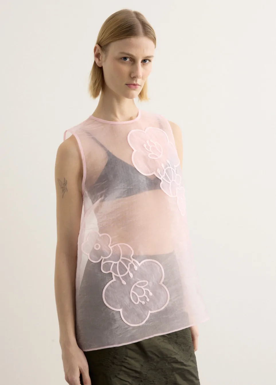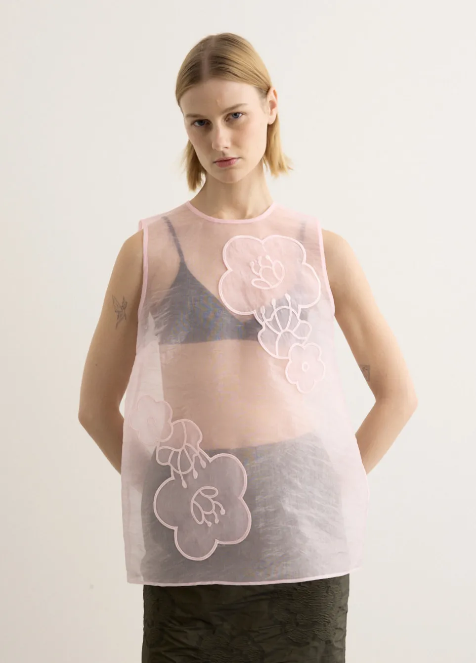 Cecilie Bahnsen, a Danish fashion designer, is renowned for her eponymous brand that blends traditional craftsmanship with contemporary design. Her collections, known for voluminous silhouettes and intricate textures, have earned acclaim for a modern, avant-garde take on femininity. Crafted from ethereal liquid myrtia, the Alba top features a sleek tank silhouette with a rounded neckline and an intricate bow closure at the back. Adorned with two large embroidered floral patches, it highlights a signature motif of Cecilie Bahnsen’s elegant and modern design.