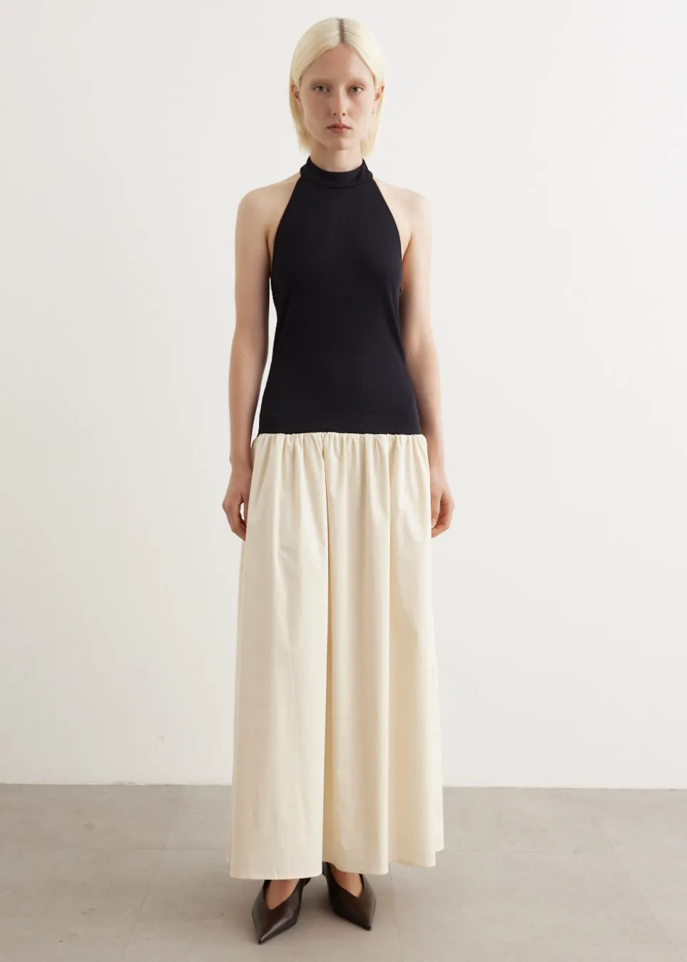 ANNA QUAN is an Australian fashion brand started by Anna Hoang in 2013. The brand highlights the art of capsule dressing by offering timeless silhouettes and essential wardrobe staples. Its collections combine classic design and understated luxury, reflecting a commitment to lasting style and quality craftsmanship. The Alice Dress is a classic silhouette from the brand, updated in a halter neckline silhouette. Featuring a double layered poplin skirt for a volume, and a slim fitted stretch rib bodice for a flattering silhouette.