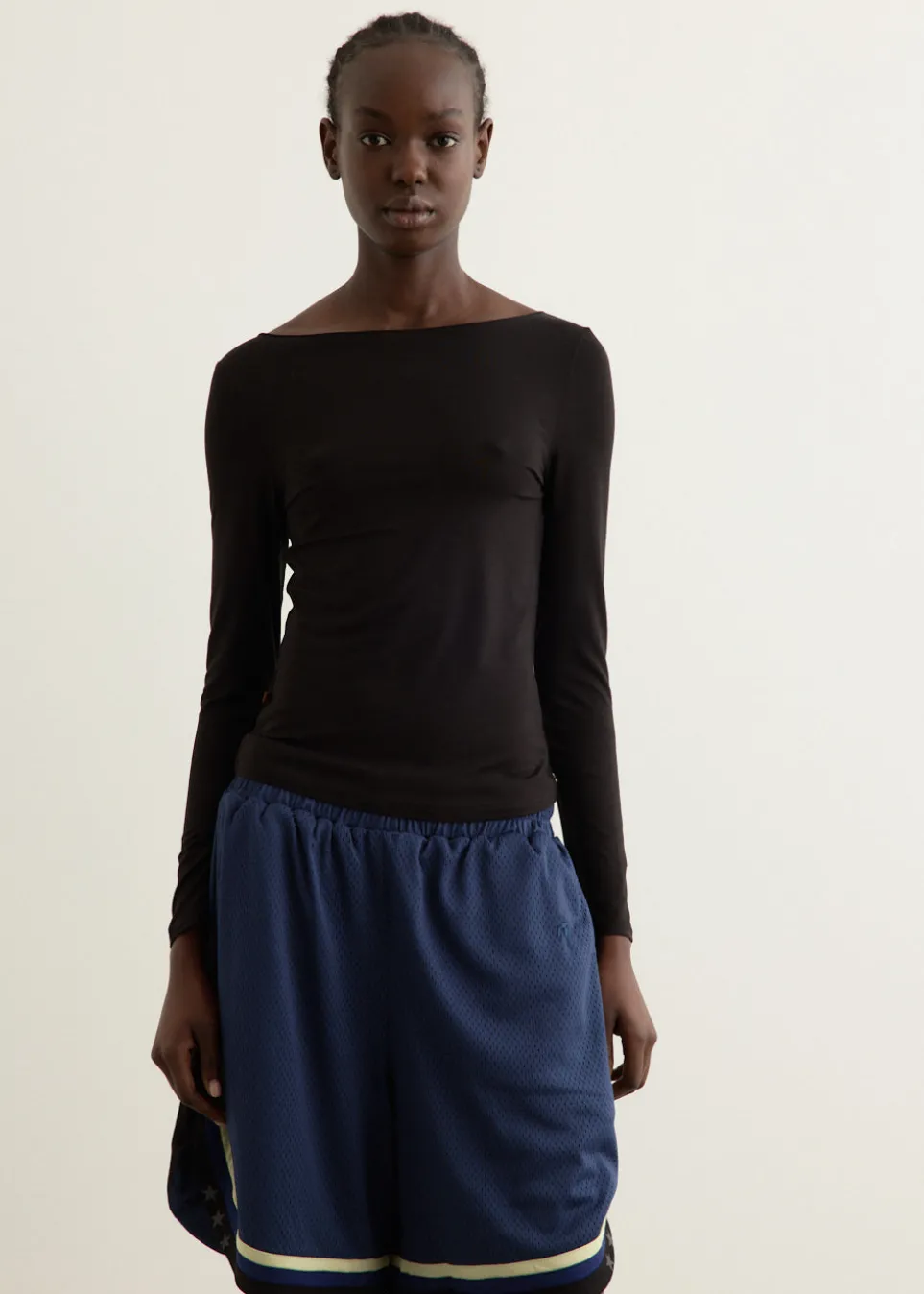 MIAOU was born where French-girl style meets Southern California-cool. The label takes vintage silhouettes and turns them into elevated, contemporary garments which echo supermodel style from the ’90s. The Amelia Top is cut to a slim fit, featuring a boat neckline and long sleeves. Adorned with a small metallic hardware logo on the hem for a branded accent.