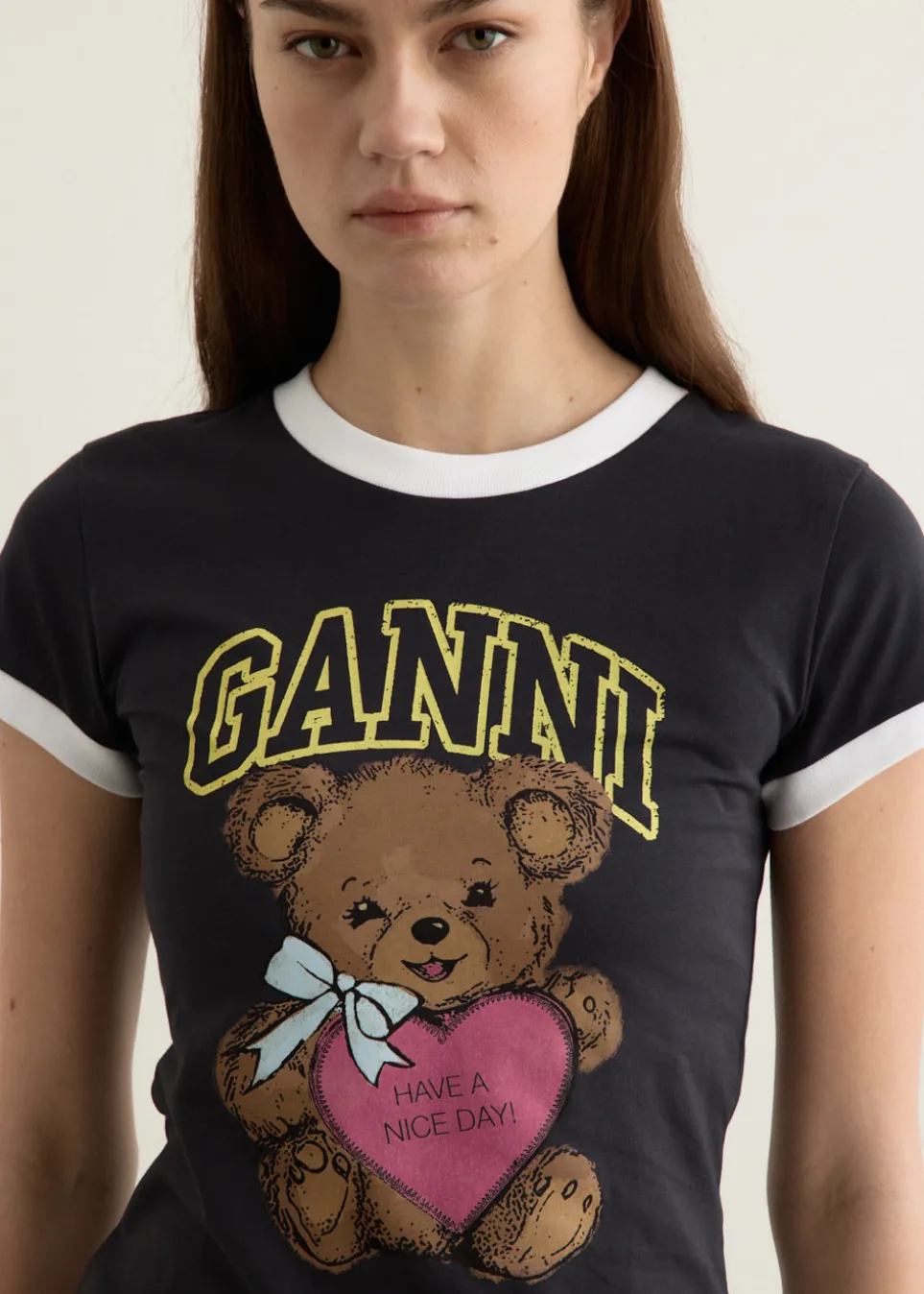 Danish label Ganni blends streetwear trends with a playful touch of humour through bold prints and colour palettes, voluminous silhouettes and easy-to-wear fabrics. Crafted from organic cotton jersey, the Basic Cotton Jersey Bear Fitted T-Shirt is designed with white contrast trims on the neckline and sleeves and is adorned with a graphic print featuring a bear on the front.