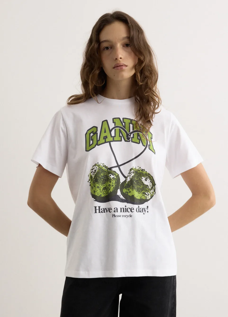 Danish label Ganni blends streetwear trends with a playful touch of humour through bold prints and colour palettes, voluminous silhouettes and easy-to-wear fabrics. Crafted from organic cotton, the Basic Jersey Cherry Relaxed T-Shirt features the GANNI logo and seasonal ‘Cherry’ graphic print on the front.