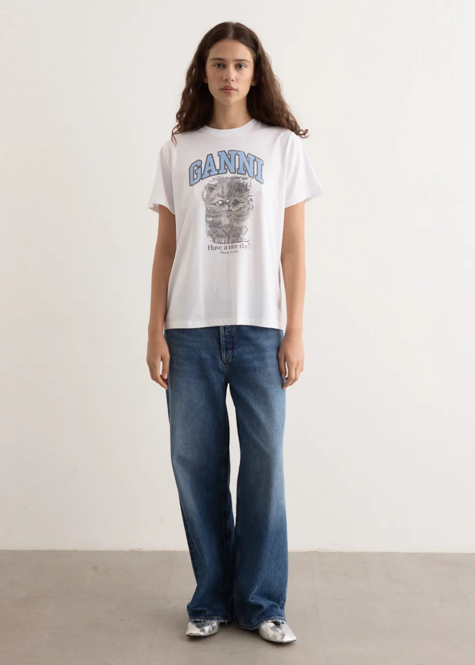 Danish label Ganni blends streetwear trends with a playful touch of humour through bold prints and colour palettes, voluminous silhouettes and easy-to-wear fabrics. Crafted from organic cotton, the Basic Jersey Kitty Margot Relaxed T-Shirt is adorned with the a bold graphic print on the front.