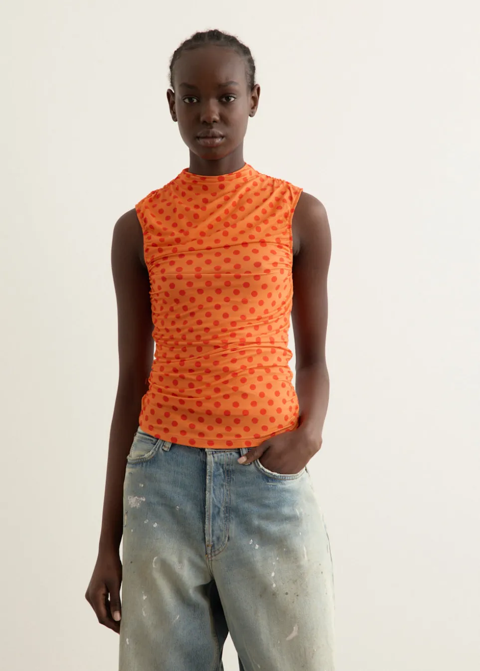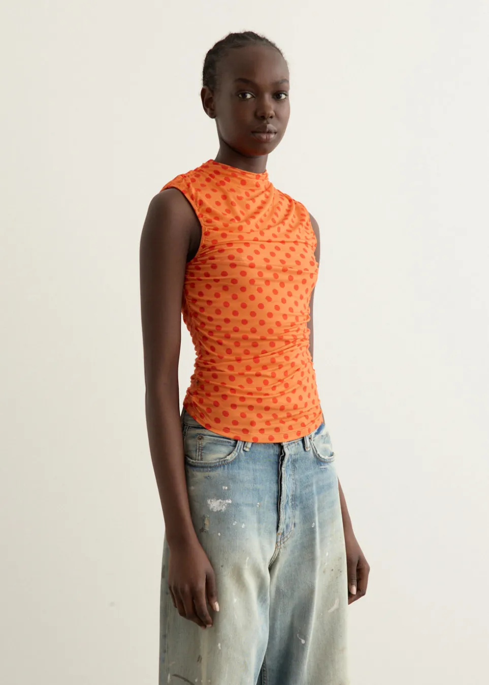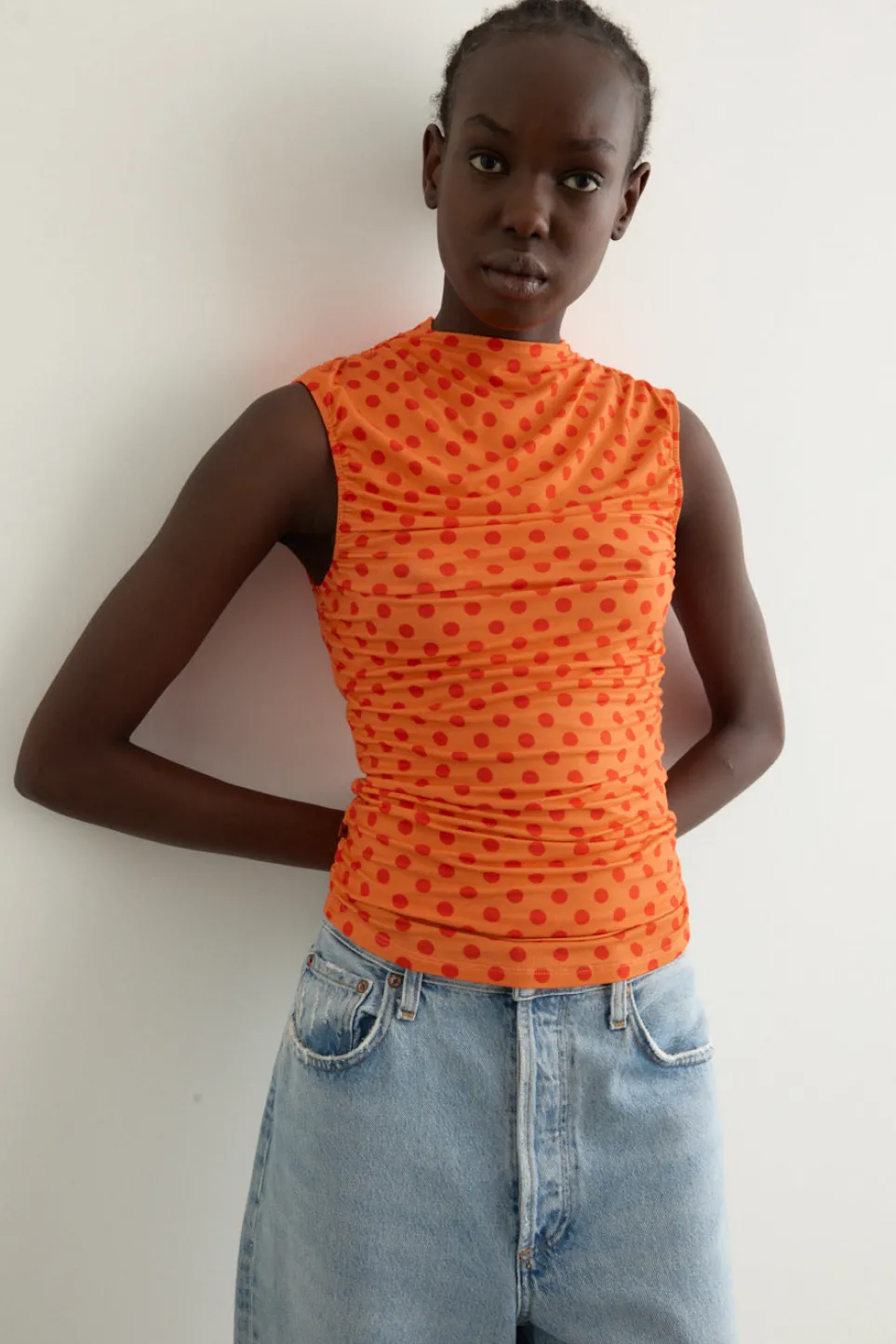 MIAOU was born where French-girl style meets Southern California-cool. The label takes vintage silhouettes and turns them into elevated, contemporary garments which echo supermodel style from the ’90s. Crafted from a soft double-layered stretch tencel jersey, the Cam Top is adorned with an all-over polka-dot print. Featuring a raised neckline, sleeveless design, detailed with all-over ruching to ensure a flattering silhouette.