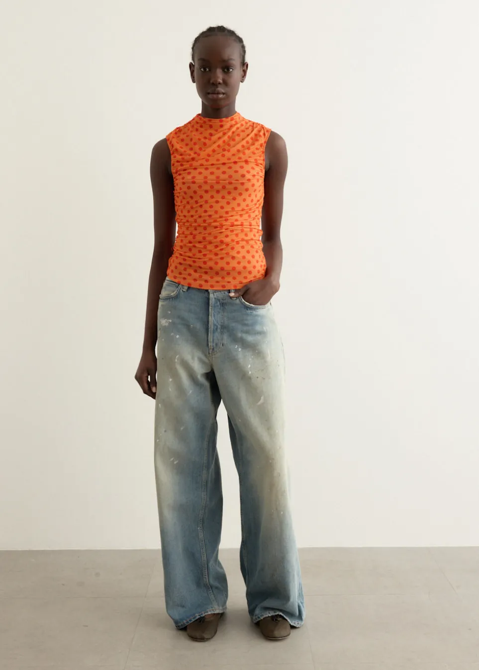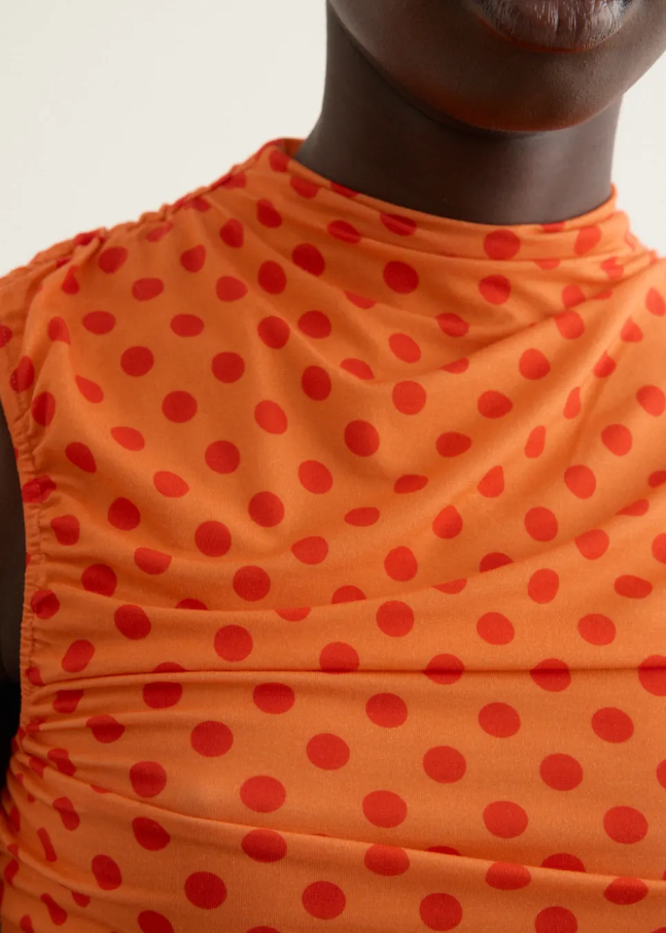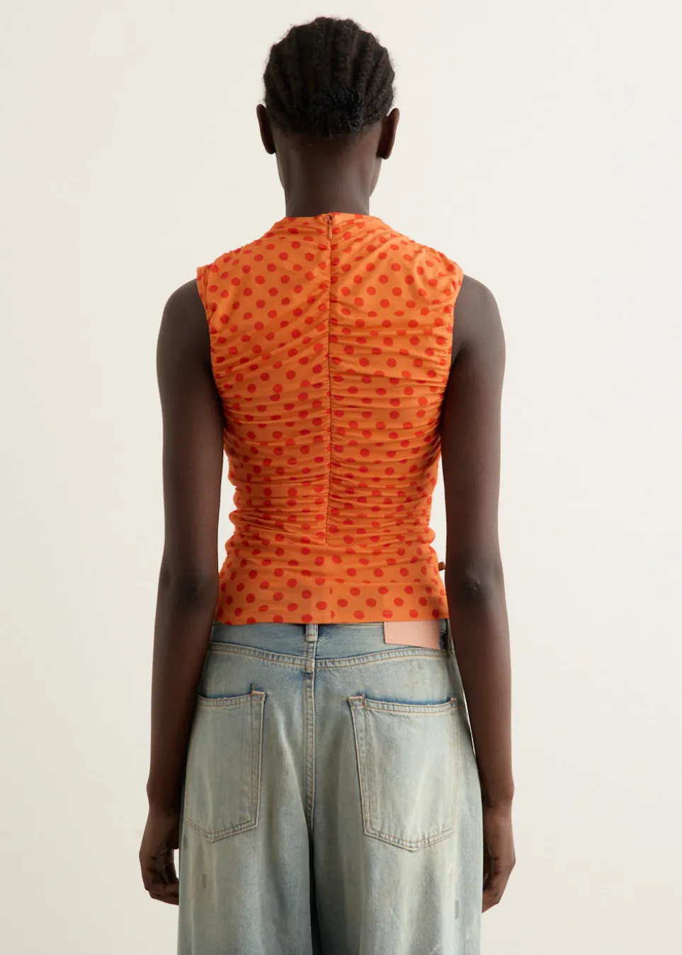 MIAOU was born where French-girl style meets Southern California-cool. The label takes vintage silhouettes and turns them into elevated, contemporary garments which echo supermodel style from the ’90s. Crafted from a soft double-layered stretch tencel jersey, the Cam Top is adorned with an all-over polka-dot print. Featuring a raised neckline, sleeveless design, detailed with all-over ruching to ensure a flattering silhouette.