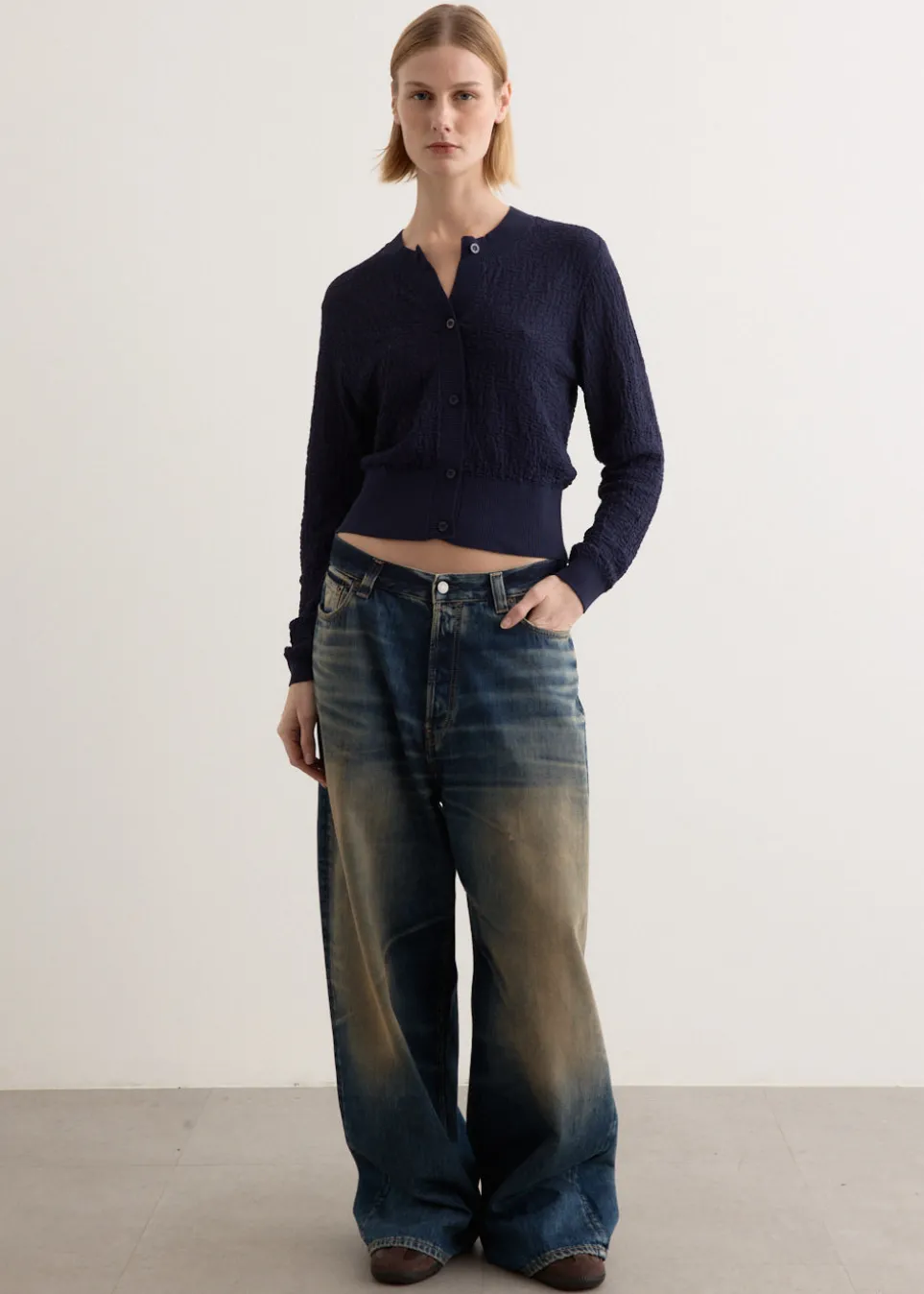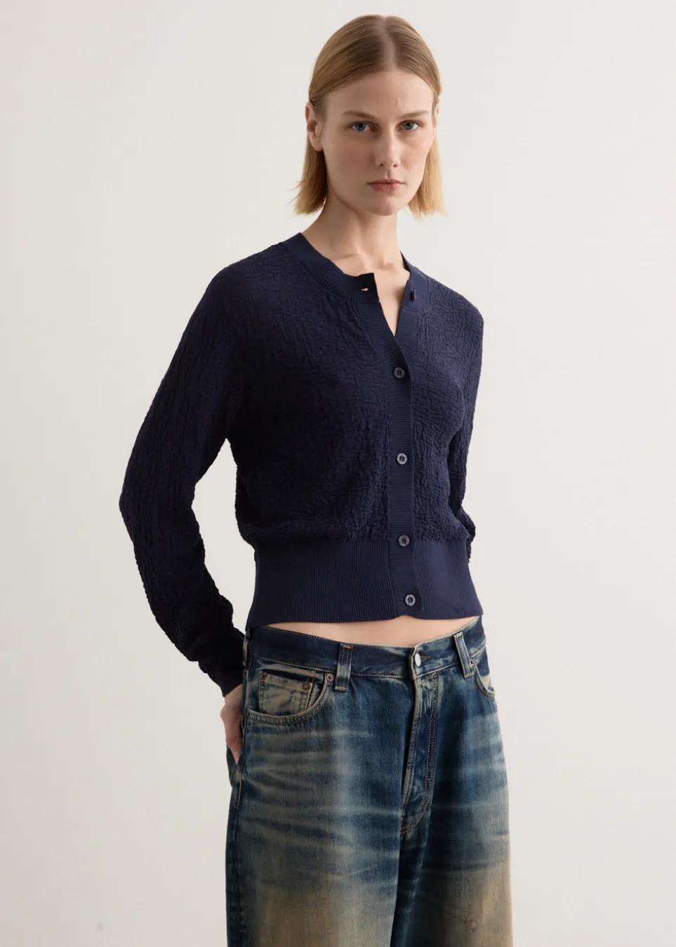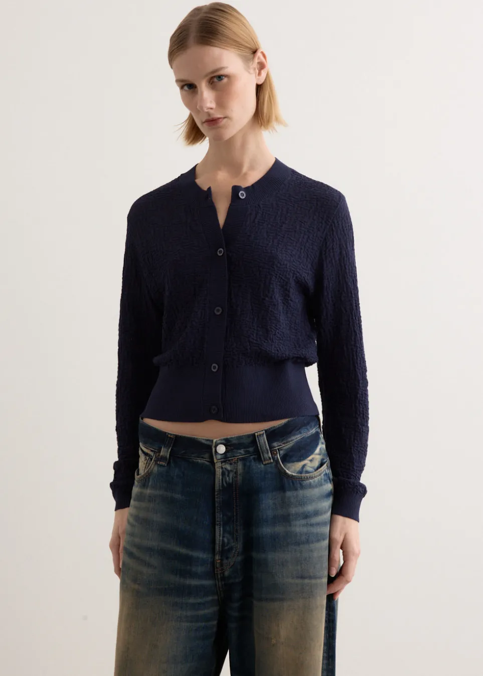 Brainchild of the designer duo Rikke Baumgarten and Helle Hestehave, Baum und Pferdgarten is the Danish label that blends modern feminine style with a playful sensibility. Crafted from a slightly crinkled cotton blend, the Chea Cardigan is cut to a cropped length featuring a round neckline and ribbed trims. The classic cardigan’s fitted silhouette is detailed with a contrast inner placket for a unique touch.