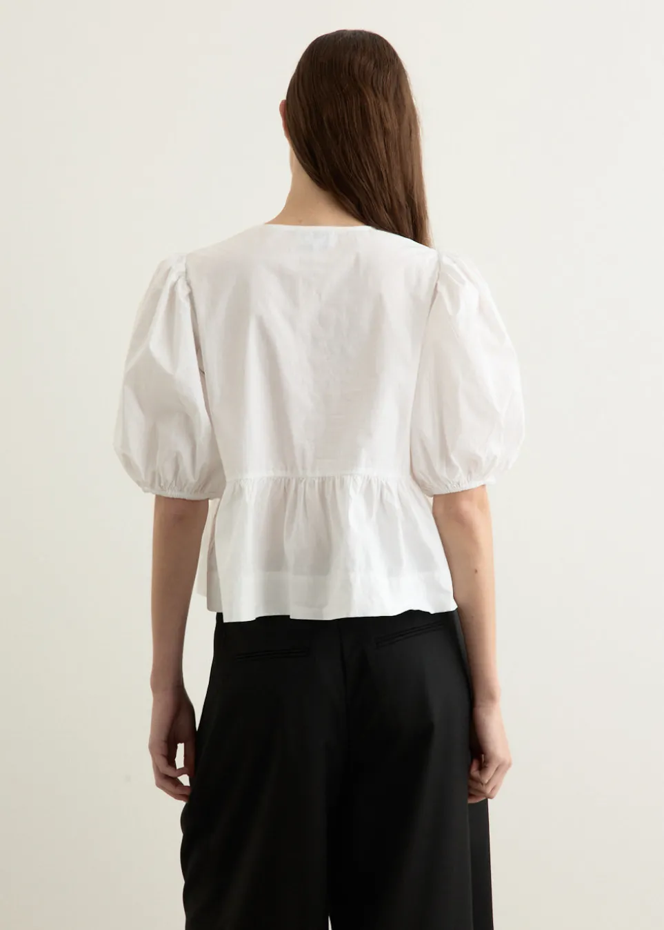Danish label Ganni blends streetwear trends with a playful touch of humour through bold prints and colour palettes, voluminous silhouettes and easy-to-wear fabrics. The Cotton Poplin Peplum Blouse boasts a crewneck adorned with semi-open self ties down the front, along with puffed sleeves and a peplum hem.