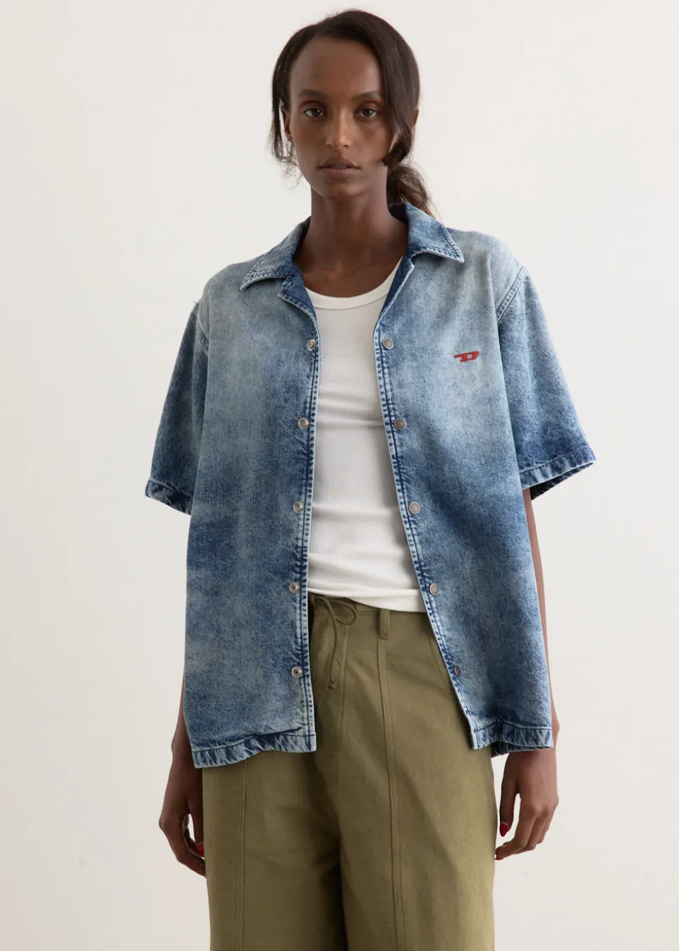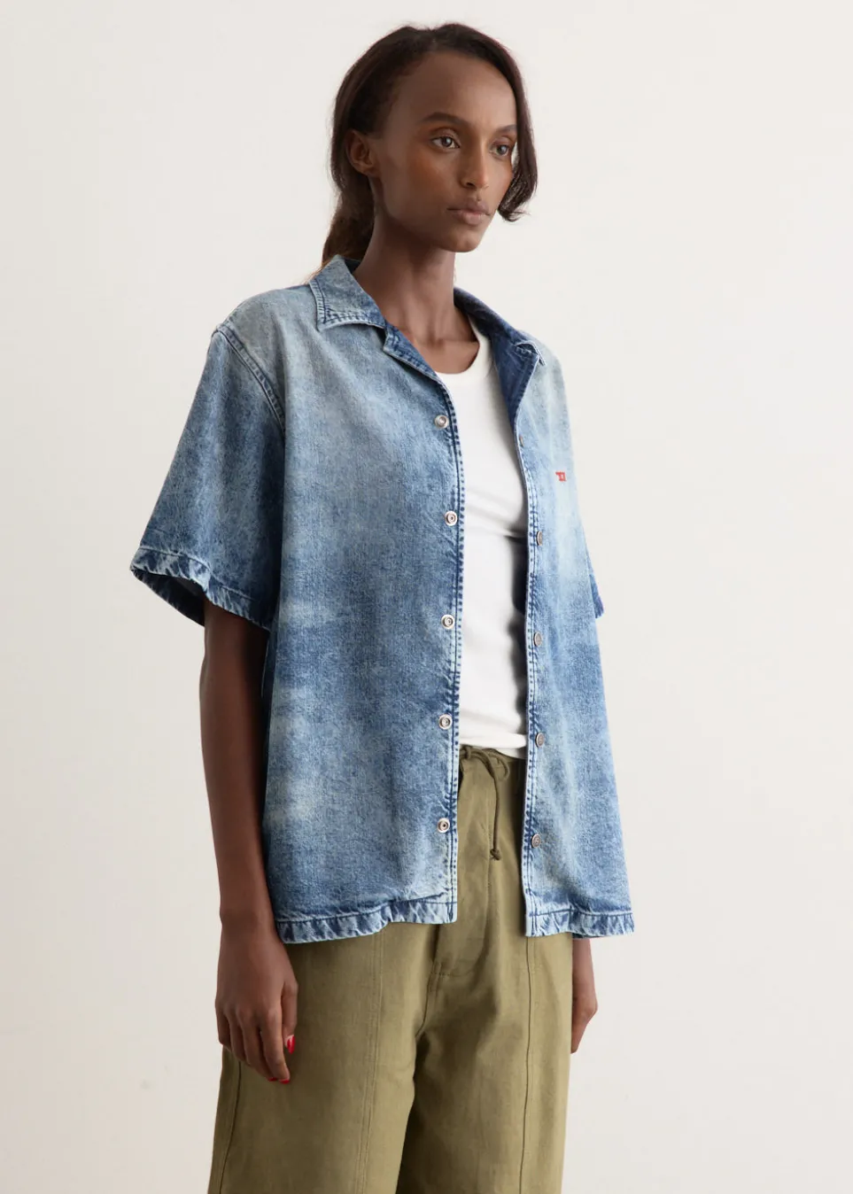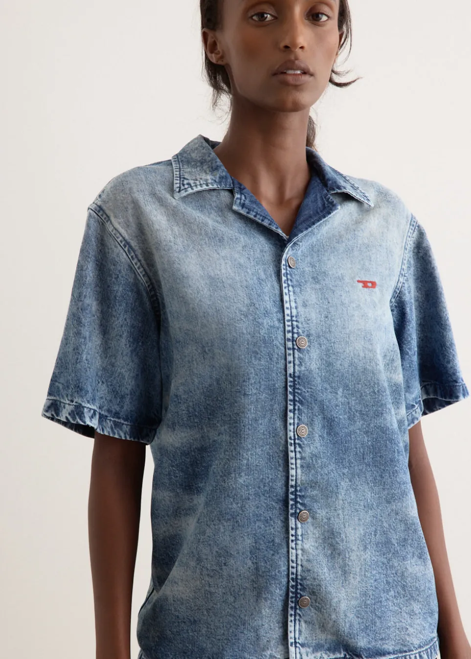 Founded in 1978, Diesel is rooted in denim mastery, known for their nostalgic Y2K-inspired pieces to create a chic yet casual look. Their collections sport denim-heavy designs in their rebellious yet playful collections. The D-Nabil-Fsg Shirt is a short-sleeve bowling shirt with a boxy fit. Made from tencel denim, it features branded snap buttons, an embroidered ‘D’ on the chest, and a distressed finish created using stonewashing and laser treatments.