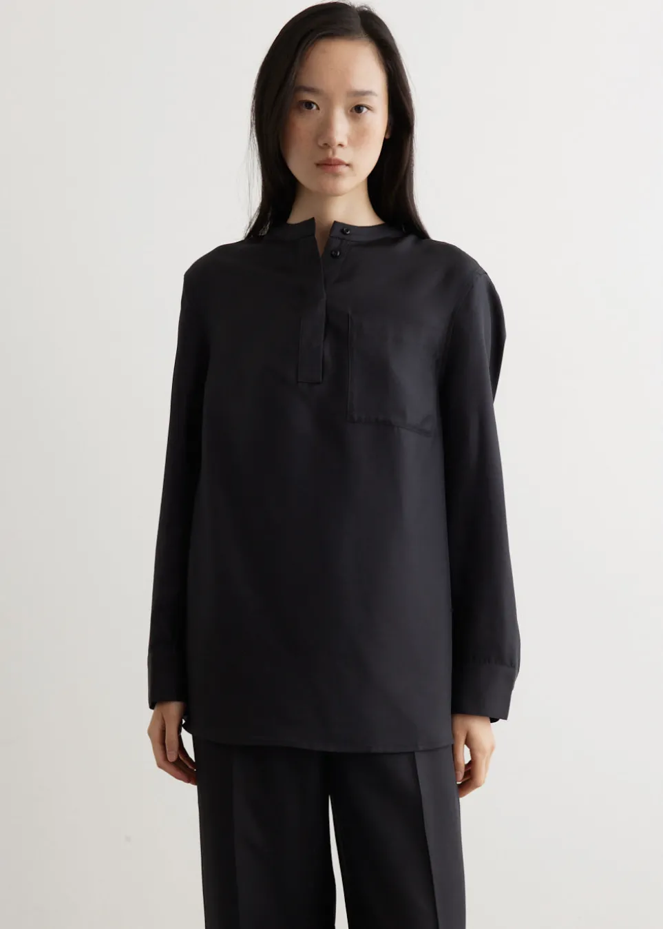 Founded by Parisian influencer Chloé Harrouche, LOULOU STUDIO has a repertoire that consists of classic silhouettes and distinguished fabrics. The collections are full of soft neutrals and careful tailoring. Crafted from pure silk, the Eden Blouse is tailored to a relaxed fit. Featuring a half-button up design with a round collar and a patch pocket on the chest.