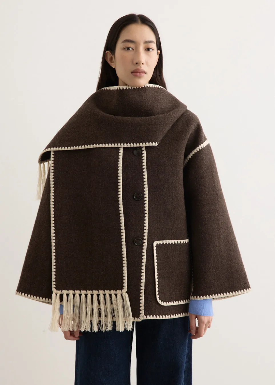 Founded in 2014 by Elin Kling and Karl Lindman, Toteme is a Stockholm-based brand renowned for crafting elevated essentials and timeless wardrobe foundations. The Embroidered Scarf Jacket draws from the brand’s Northern European roots, made from a sturdy wool blend with an inbuilt scarf. Characterised by its fringed scarf and distinctive chain-stitched trims, Totême’s jacket balances ultimate comfort with sophistication.