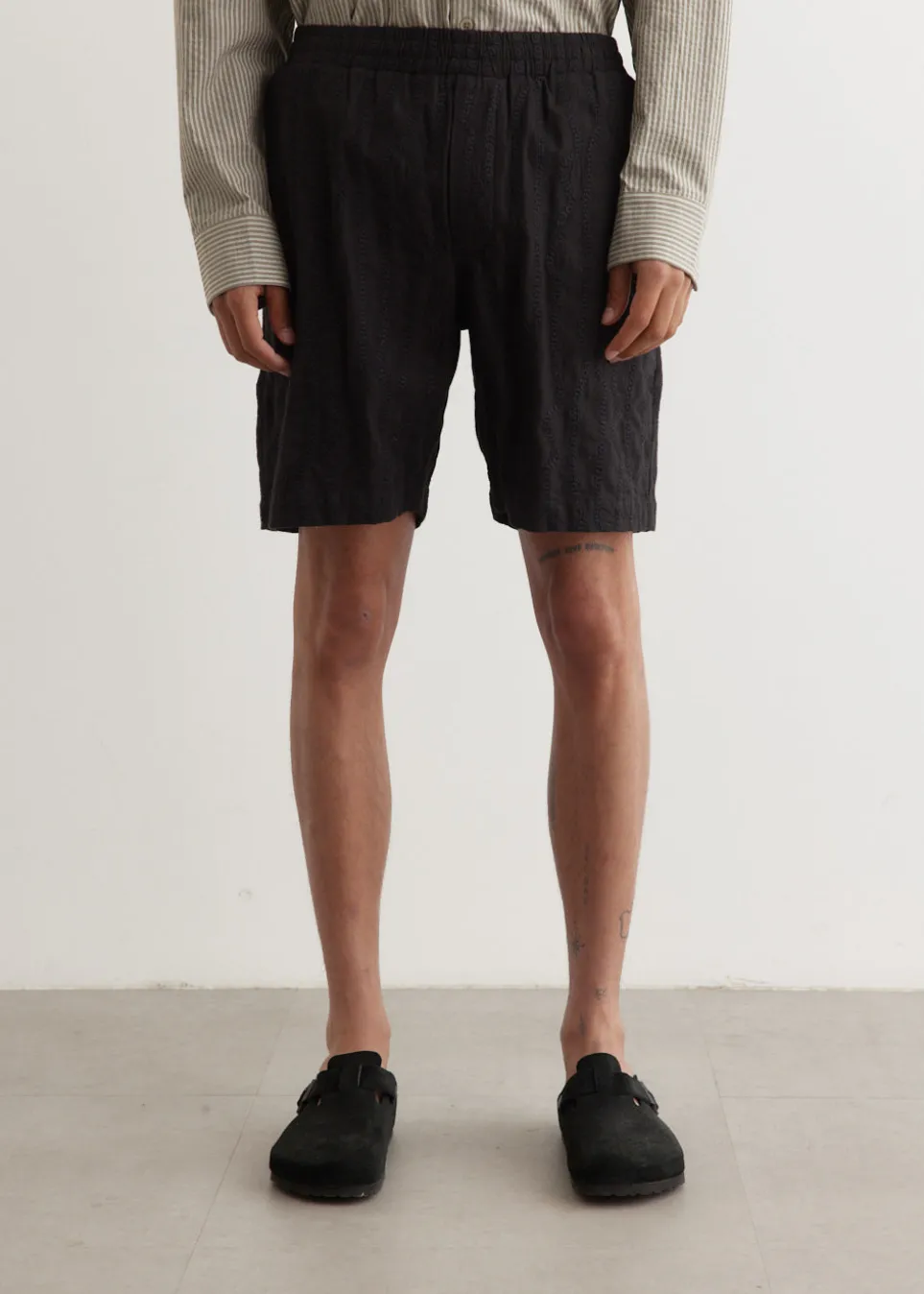 Incu Collection blends masculine and feminine styles creatively, offering refined tailored silhouettes and curated detailing for a unique and functional fashion statement. Crafted from a cotton blend with intricate embroidery, the Textured Smokestack Shorts boast a boxy cut and wide-leg silhouette for a stylish and comfortable fit.