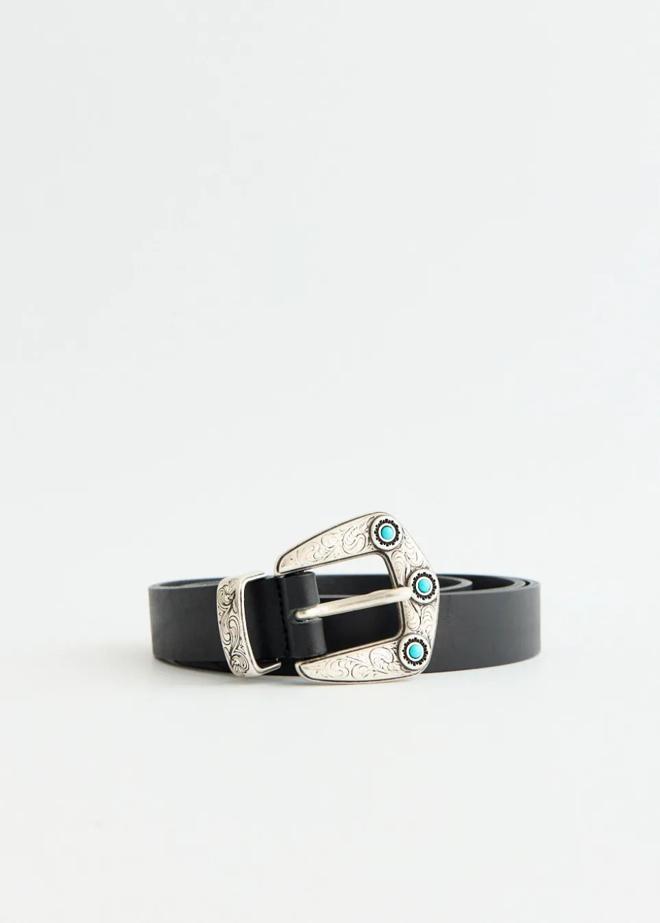 Molebo is a unisex belt brand founded in 2024 by a family of artisans with generations of craftsmanship. Each belt is handmade in Tommerup, Denmark, with a focus on quality and sustainability. Crafted from LWG-certified cow leather, the Fancy Western Belt is designed with a decorated, western-inspired brass buckle, finished with turquoise coloured stones.